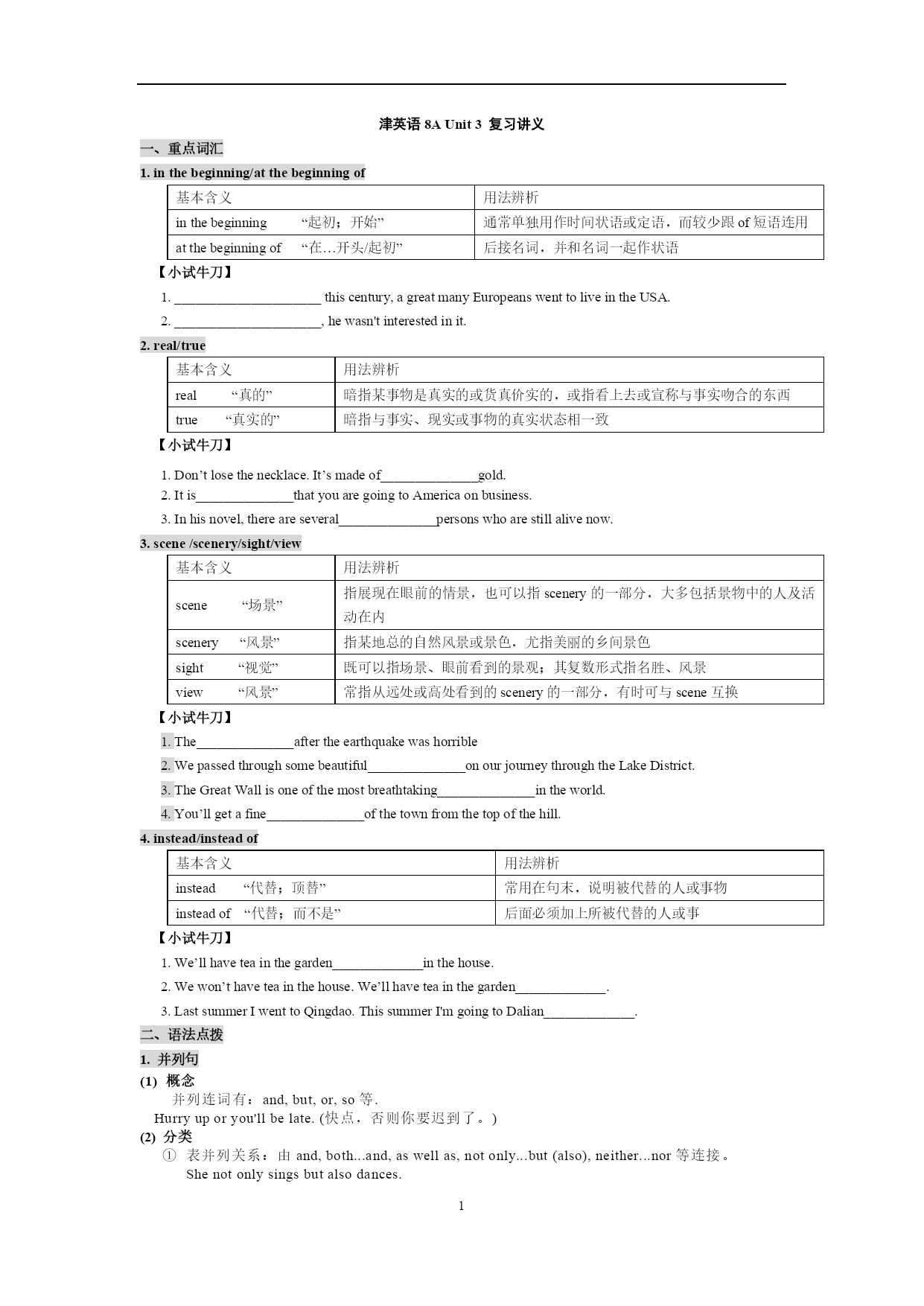 PAGE\*MERGEFORMAT5津英语8AUnit3复习讲义一、重点词汇1.inthebeginning/atthebeginningof基本含义用法辨析inthebeginning“起初;开始”通常单独用作时间状语或定语,而较少跟of短语连用atthebeginningof“在…开头/起初”后接名词,并和名词一起作状语【小试牛刀】1._____________________thiscentury,agreatmanyEuropeanswenttoliveintheUSA.2.________