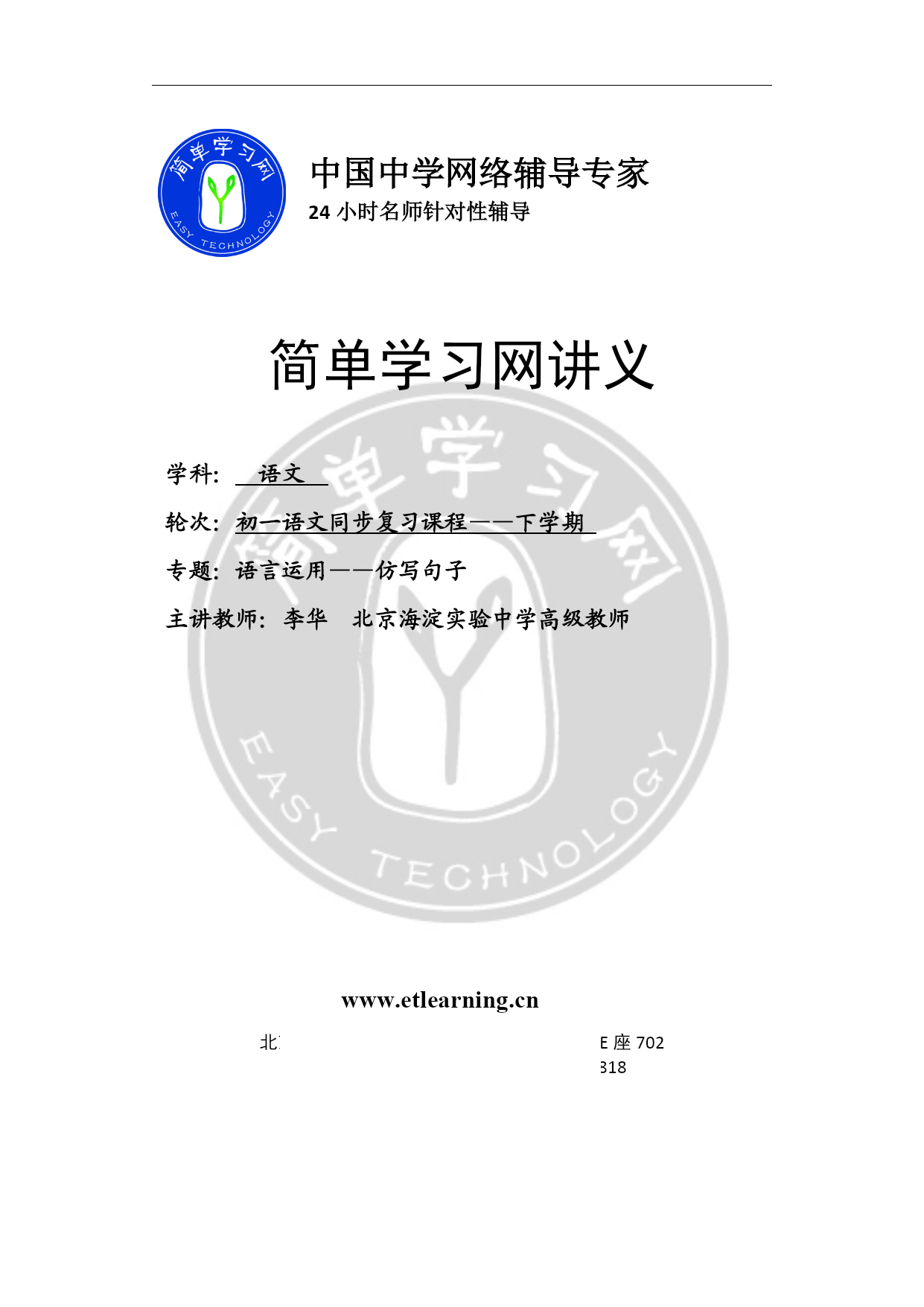 北京简单科技有限公司PAGEPAGE4中国中学网络辅导专家24小时名师针对性辅导简单学习网讲义学科:语文轮次:初一语文同步复习课程——下学期专题:语言运用——仿写句子主讲教师:李华北京海淀实验中学高级教师www.etlearning.cn北京市海淀区上地东路1号盈创动力大厦E座702全国24小时免费咨询电话4008-110-818总机:01058858883轮次:初一语文同步复习课程——下学期专题:语言运用——仿写句子主讲教师:李华第一部分开篇语第二部分考点梳理1.请根据你对“微笑”的理解,仿