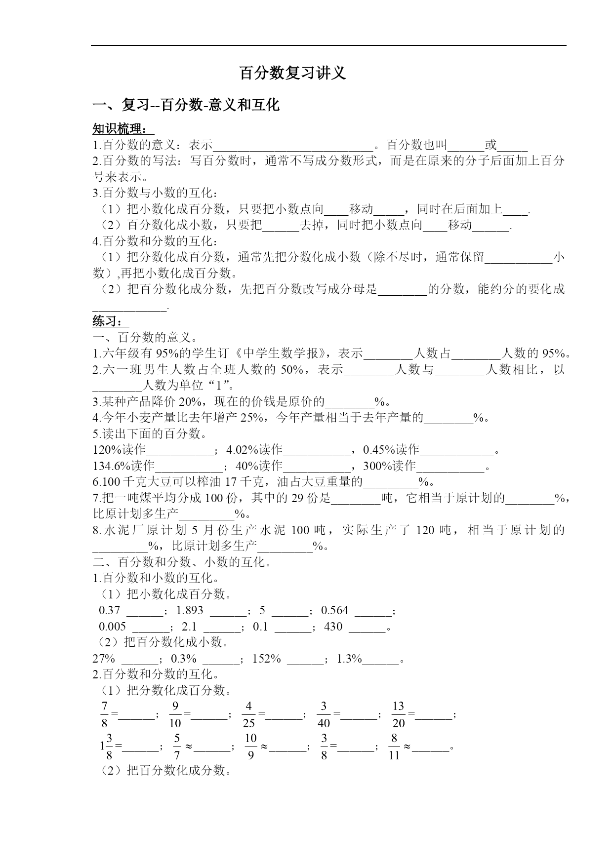 百分数复习讲义一、复习--百分数-意义和互化知识梳理:1.百分数的意义:表示__________________________。百分数也叫______或_____2.百分数的写法:写百分数时,通常不写成分数形式,而是在原来的分子后面加上百分号来表示。3.百分数与小数的互化:(1)把小数化成百分数,只要把小数点向____移动_____,同时在后面加上____.(2)百分数化成小数,只要把______去掉,同时把小数点向____移动______.4.百分数和分数的互化:(1)把分数化成百分数,通常先把分数化