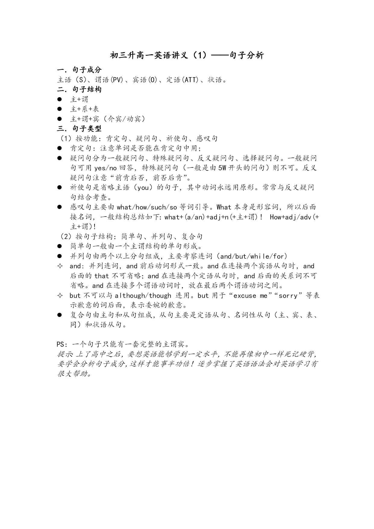 初三升高一英语讲义(1)——句子分析句子成分主语(S)、谓语(PV)、宾语(O)、定语(ATT)、状语。句子结构主+谓主+系+表主+谓+宾(介宾/动宾)句子类型按功能:肯定句、疑问句、祈使句、感叹句肯定句:注意单词是否能在肯定句中用;疑问句分为一般疑问句、特殊疑问句、反义疑问句、选择疑问句。一般疑问句可用yes/no回答,特殊疑问句(一般是由5W开头的问句)则不可。反义疑问句注意“前肯后否,前否后肯”。祈使句是省略主语(you)的句子,其中动词永远用原形。常常与反义疑问句结合考查。感叹句主要由what/h