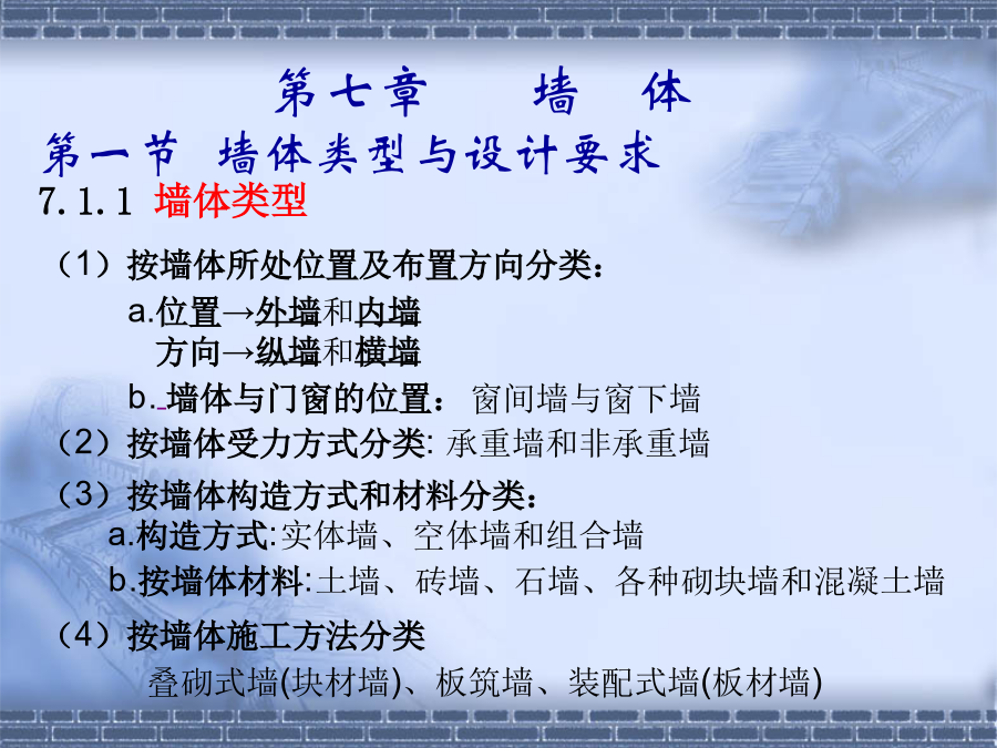 第七章墙体7.1.2建筑物墙体的设计要求(1).横墙承重体系2.墙体的强度和稳定性(1)保温要求7.1.2墙体的设计要求水汽对建筑热工性能的不利影响基本对策——阻止水汽进入保温材料内,防止凝结水的出现,并安排通道以使进入建筑外围护结构中的水汽能够排出。2.其它方面的要求①防火要求选材、防火分区、防火墙②防水防潮要求③建筑工业化要求第二节砖墙构造2.砂浆—粘结材料B.类型:水泥砂浆混合砂浆石灰砂浆C.标号M15、M10、M7.5、M5、M2.5、M1、M0.4强度—砂浆为刚性材料,主要考虑抗压强度。其强度等