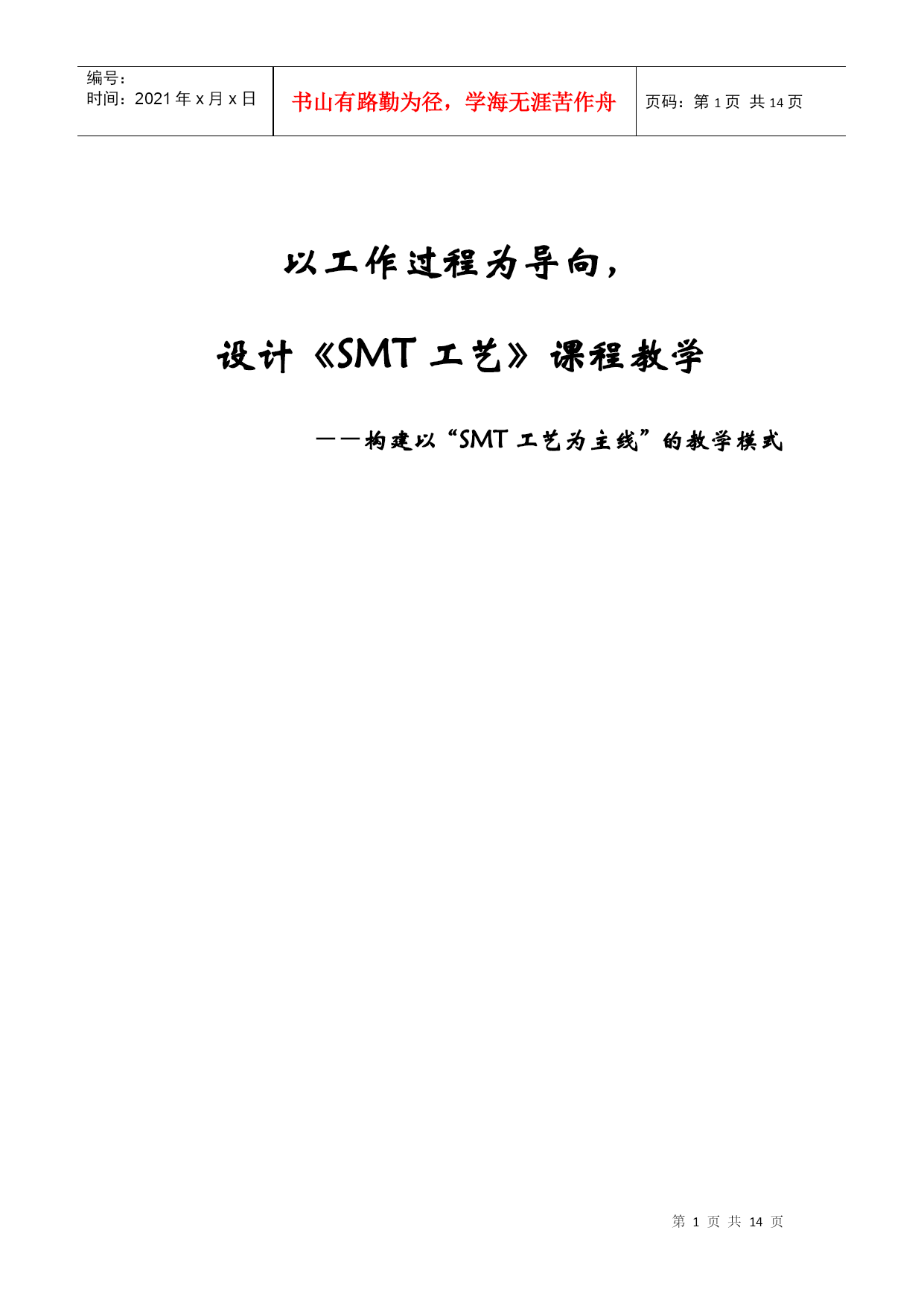 编号:时间:2021年x月x日书山有路勤为径,学海无涯苦作舟页码:第PAGE14页共NUMPAGES14页第PAGE\*MERGEFORMAT14页共NUMPAGES\*MERGEFORMAT14页以工作过程为导向,设计《SMT工艺》课程教学――构建以“SMT工艺为主线”的教学模式《SMT工艺》课程教学设计简介《SMT工艺》(SurfaceMountingTechnology)课程的整体教学设计,“强调职业方向,注重技能培养,强调行业特点,注重企业需求”。按照“工作过程导向”的高职