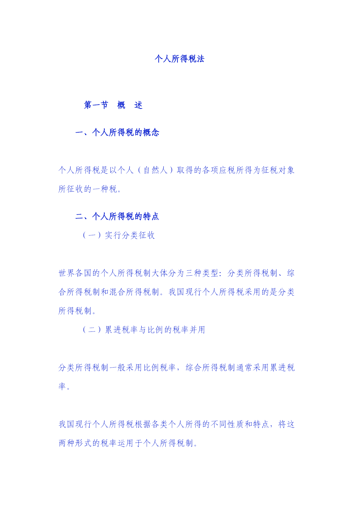 个人所得税法第一节概述一、个人所得税的概念个人所得税是以个人(自然人)取得的各项应税所得为征税对象所征收的一种税。二、个人所得税的特点(一)实行分类征收世界各国的个人所得税制大体分为三种类型:分类所得税制、综合所得税制和混合所得税制。我国现行个人所得税采用的是分类所得税制。(二)累进税率与比例的税率并用分类所得税制一般采用比例税率,综合所得税制通常采用累进税率。我国现行个人所得税根据各类个人所得的不同性质和特点,将这两种形式的税率运用于个人所得税制。(三)费用扣除额较宽对工资、薪金所得,每月减除费用200