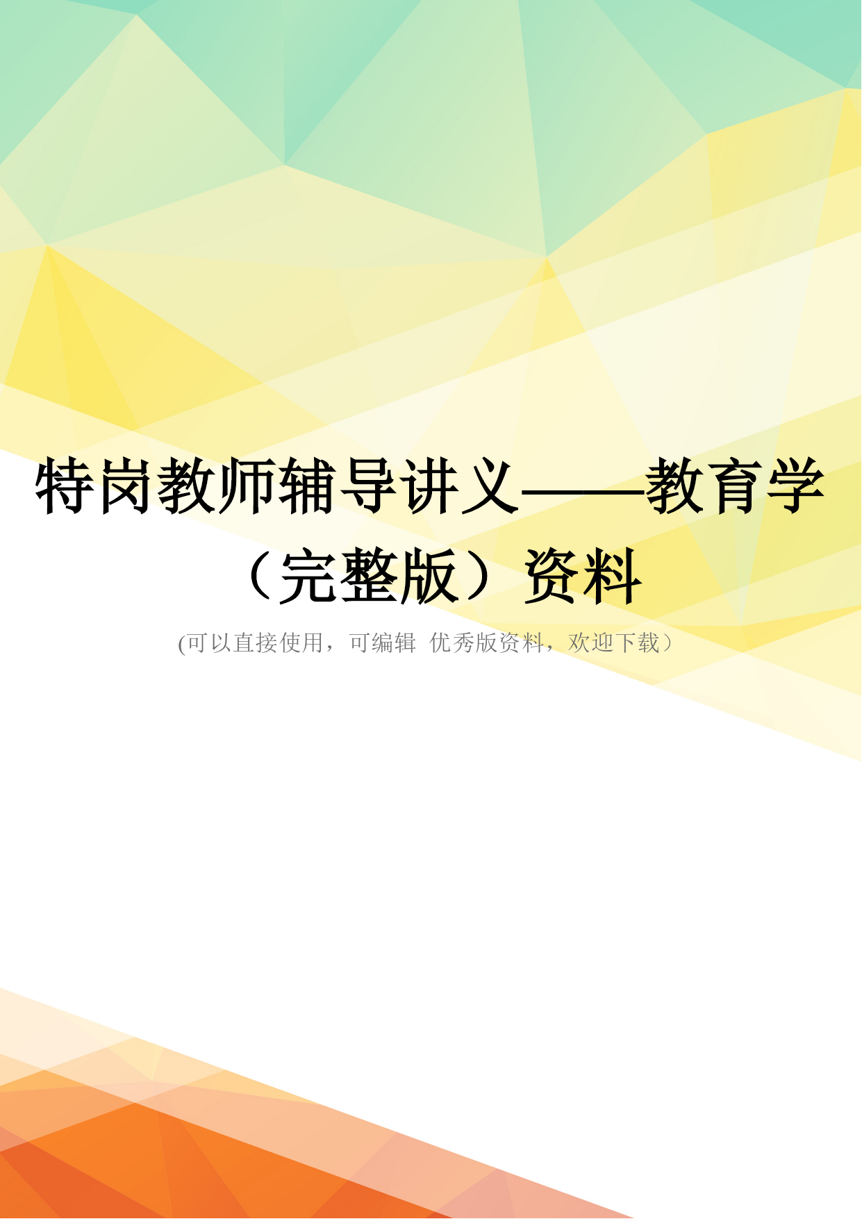 特岗教师辅导讲义——教育学(完整版)资料(可以直接使用,可编辑优秀版资料,欢迎下载)2021年特岗教师招聘考试辅导讲义——教育学孙世强——09语文教育1班第一章教育学的概述1含义:教育学是一门研究教育现象和教育问题,揭示教育规律的科学。2教育学的产生和发展:萌芽期—《学记》—世界上第一本专门论述教育的著作。昆体良的《雄辩术原理》(又称《论演说家的教育》)—西方第一本专门论述教育的著作(教学法)。成形期—夸美纽斯—《大教学论》—成为独立学科发展期—赫尔巴特的《普通教育学》独立学科的标志。3教育学的研究对象: