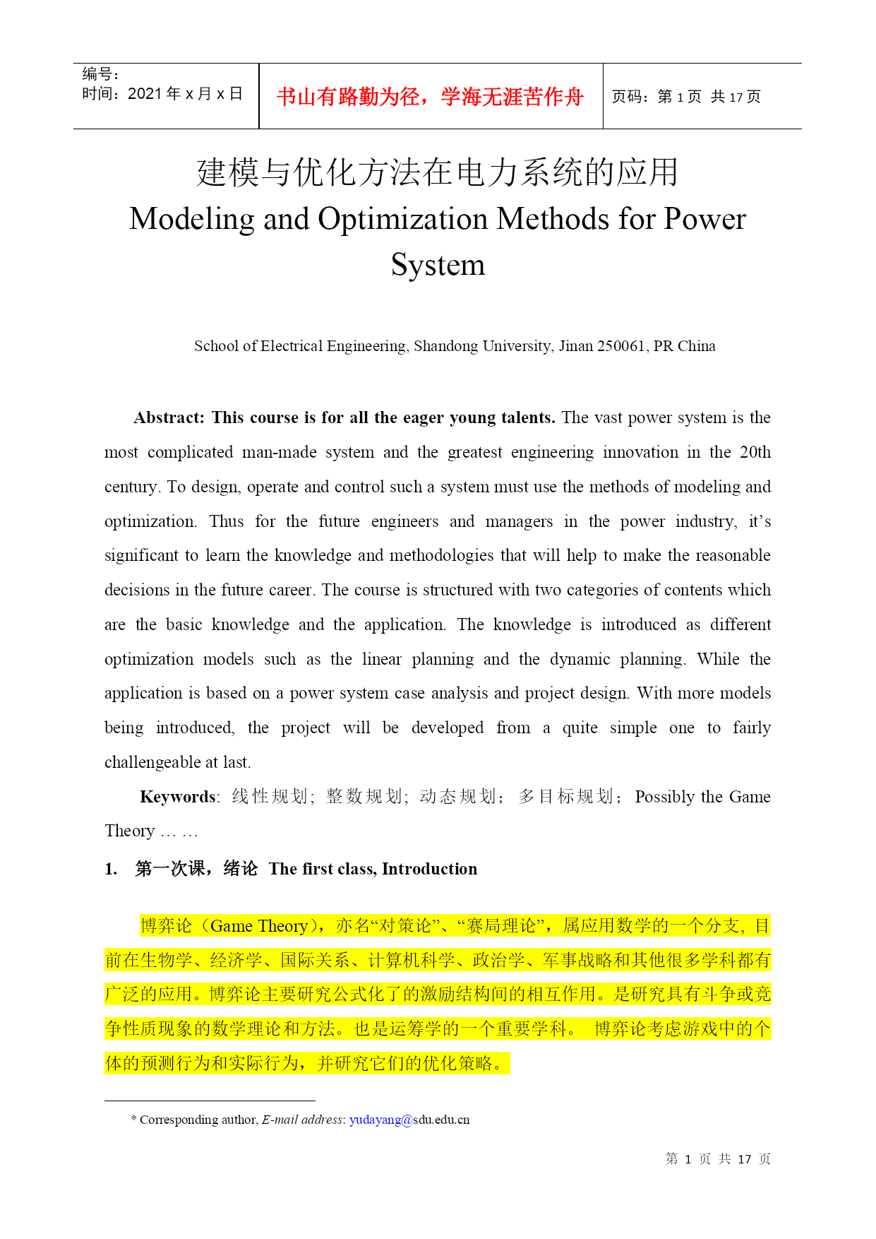 编号:时间:2021年x月x日书山有路勤为径,学海无涯苦作舟页码:第PAGE17页共NUMPAGES17页第PAGE\*MERGEFORMAT17页共NUMPAGES\*MERGEFORMAT17页建模与优化方法在电力系统的应用ModelingandOptimizationMethodsforPowerSystemSchoolofElectricalEngineering,ShandongUniversity,Jinan250061,PRChina*Correspondingaut