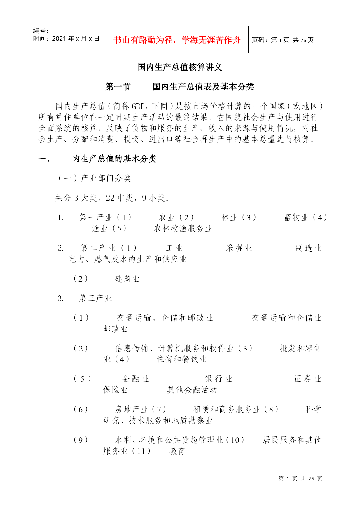 编号:时间:2021年x月x日书山有路勤为径,学海无涯苦作舟页码:第PAGE26页共NUMPAGES26页第PAGE\*MERGEFORMAT26页共NUMPAGES\*MERGEFORMAT26页国内生产总值核算讲义第一节国内生产总值表及基本分类国内生产总值(简称GDP,下同)是按市场价格计算的一个国家(或地区)所有常住单位在一定时期生产活动的最终结果。它围绕社会生产与使用进行全面系统的核算,反映了货物和服务的生产、收入的来源与使用情况,对社会生产、分配和消费、投资、进出口等社会