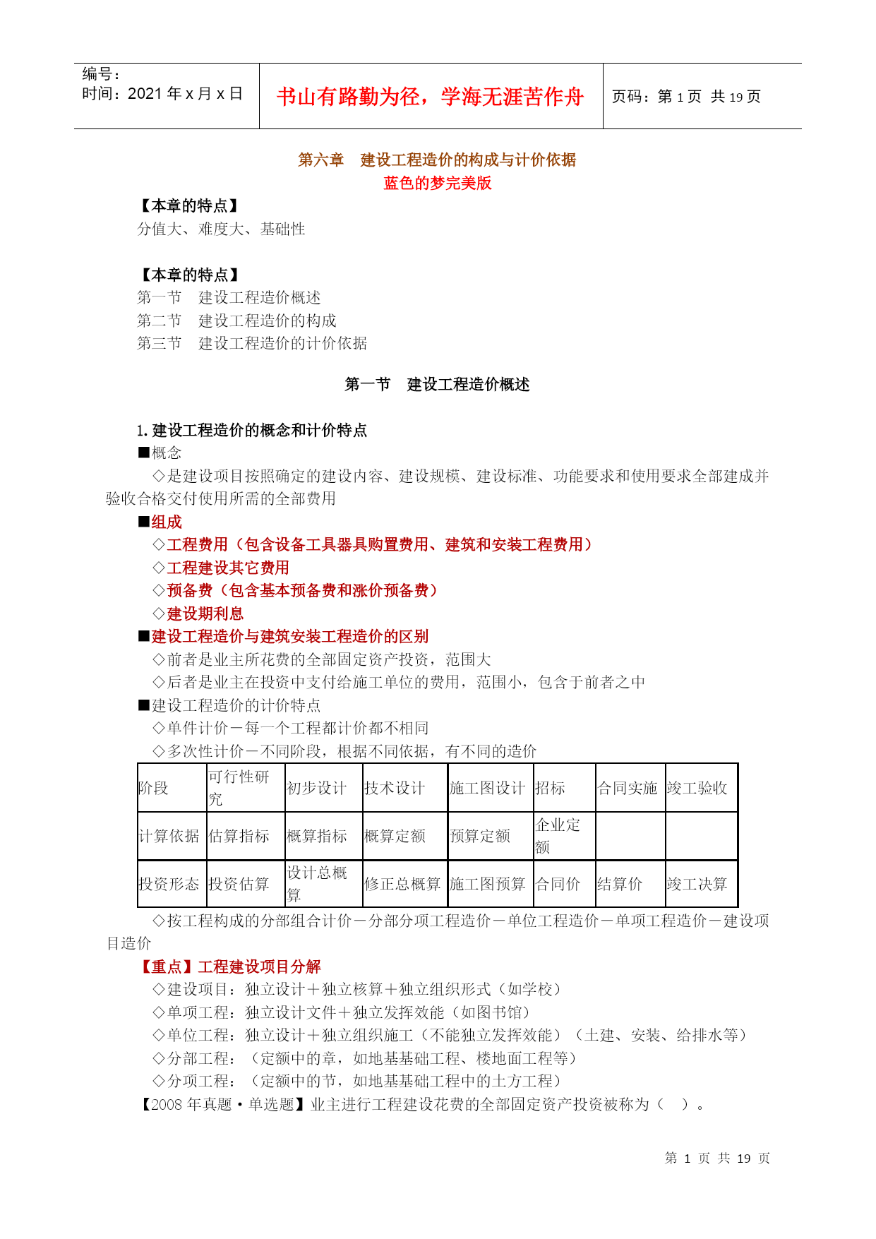 编号:时间:2021年x月x日书山有路勤为径,学海无涯苦作舟页码:第PAGE19页共NUMPAGES19页第PAGE\*MERGEFORMAT19页共NUMPAGES\*MERGEFORMAT19页第六章建设工程造价的构成与计价依据蓝色的梦完美版【本章的特点】分值大、难度大、基础性【本章的特点】第一节建设工程造价概述第二节建设工程造价的构成第三节建设工程造价的计价依据第一节建设工程造价概述1.建设工程造价的概念和计价特点■概念◇是建设项目按照确定的建设内容、建设规模、建设标准、功能