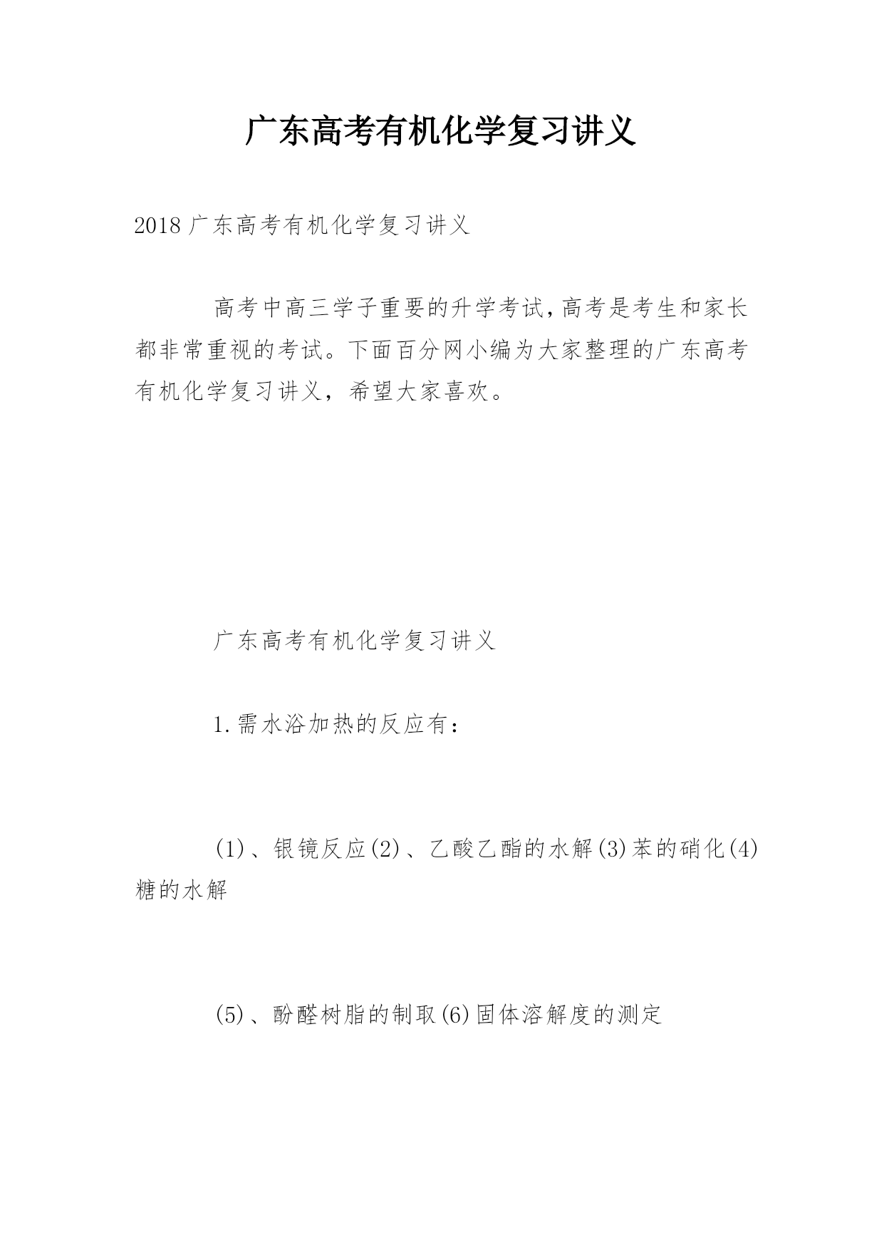 广东高考有机化学复习讲义2018广东高考有机化学复习讲义高考中高三学子重要的升学考试,高考是考生和家长都非常重视的考试。下面百分网小编为大家整理的广东高考有机化学复习讲义,希望大家喜欢。广东高考有机化学复习讲义1.需水浴加热的反应有:(1)、银镜反应(2)、乙酸乙酯的水解(3)苯的硝化(4)糖的水解(5)、酚醛树脂的制取(6)固体溶解度的测定凡是在不高于100℃的条件下反应,均可用水浴加热,其优点:温度变化平稳,不会大起大落,有利于反应的进行。2.需用温度计的实验有:(1)、实验室制乙烯(170℃)(2)