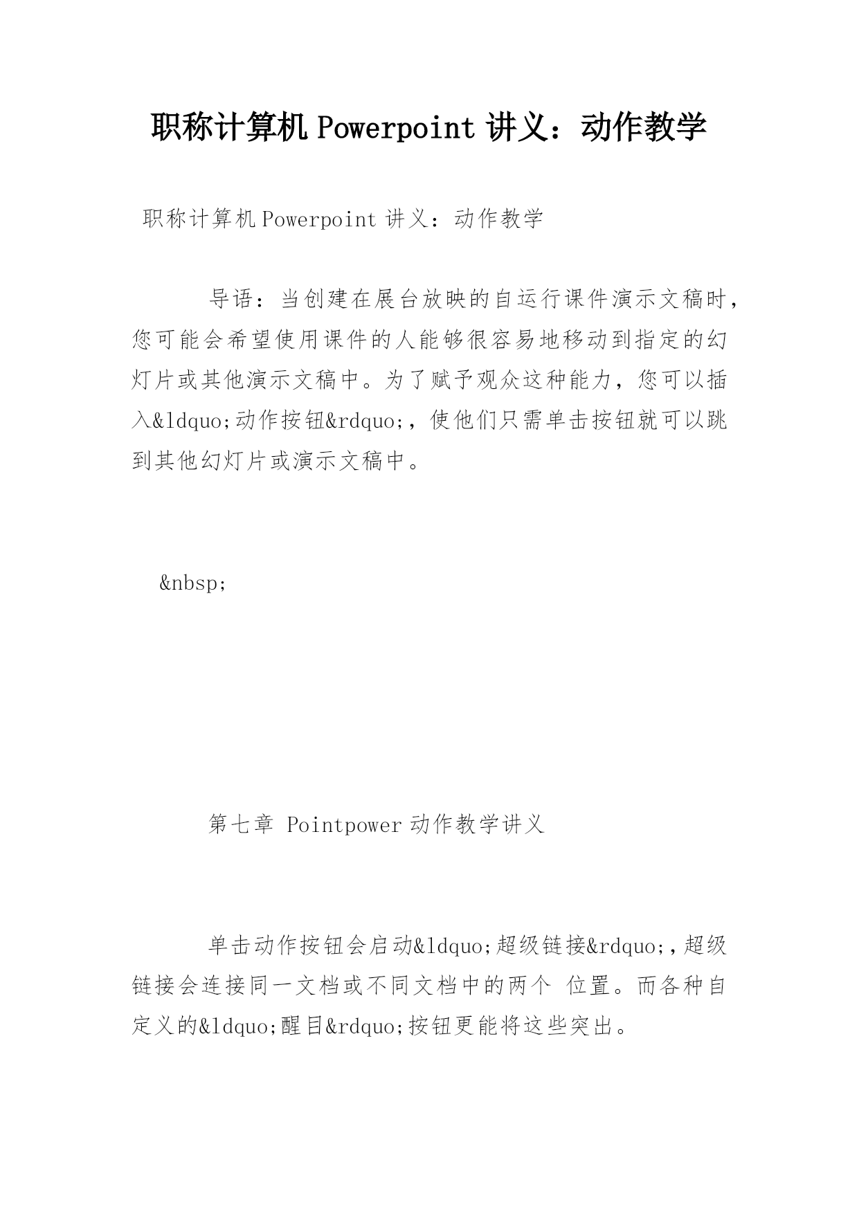 职称计算机Powerpoint讲义:动作教学职称计算机Powerpoint讲义:动作教学导语:当创建在展台放映的自运行课件演示文稿时,您可能会希望使用课件的人能够很容易地移动到指定的幻灯片或其他演示文稿中。为了赋予观众这种能力,您可以插入“动作按钮”,使他们只需单击按钮就可以跳到其他幻灯片或演示文稿中。 第七章Pointpower动作教学讲义单击动作按钮会启动“超级链接”,超级链接会连接同一文档或不同文档中的两个位置。而各种自定义的“醒