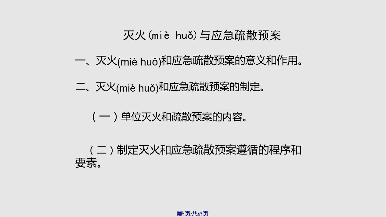 灭火(mièhuǒ)与应急疏散预案第一节灭火和应急疏散预案的意义和作用我国消防工作的方针是“预防为主、防消结合”。通常情况下,通过消防宣传、教育(jiàoyù)与培训,通过实行消防安全责任制,完善消防安全制度,通过必要的技术手段,绝大多数火灾是可以预防的。然而,要绝对杜绝火灾的发生又是不可能的,或者说是难以做到的。问题的关键不是火灾是否能杜绝,而是一旦发生火灾,能否及时有效地扑灭。这就是说,预防虽然重要,但是,不能解决所有的问题,“防”和“消”必须结合起来。灭火预案就是解决“消”这一手硬。没有灭火预案,当