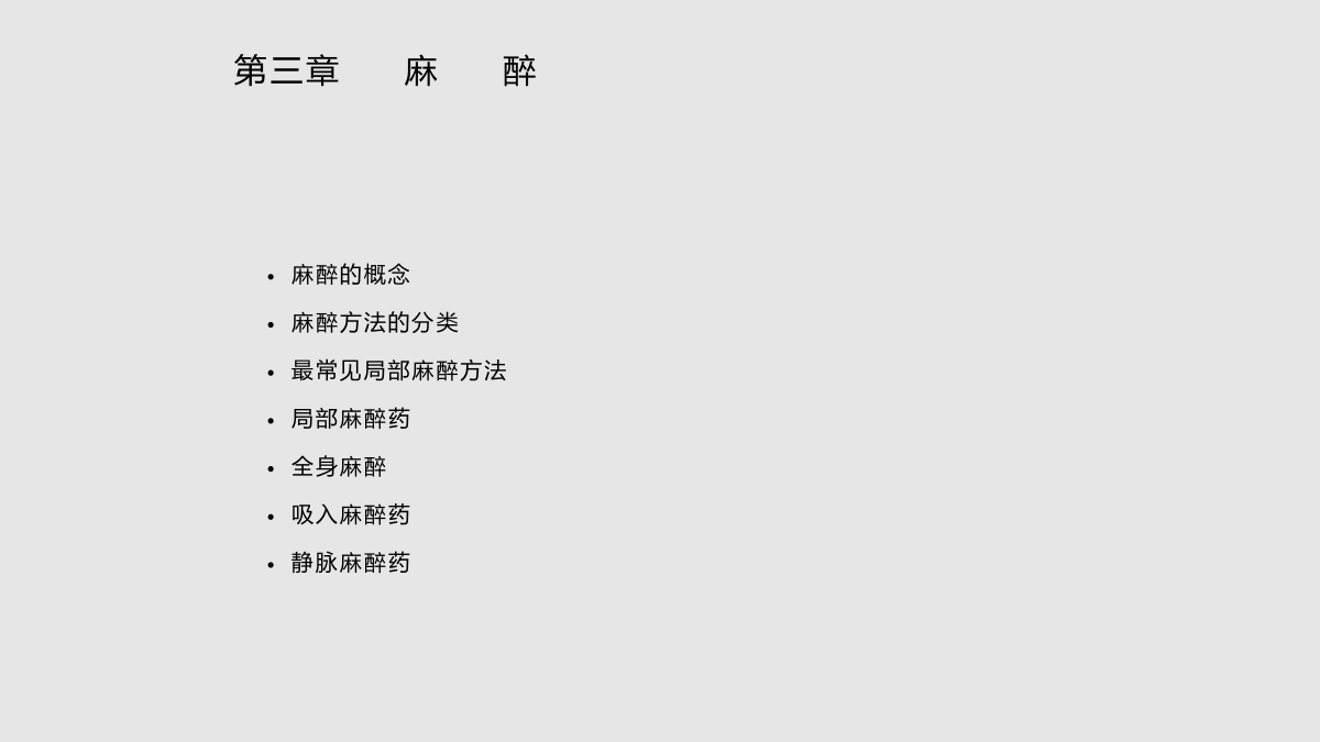 第三章麻醉第一节概述:麻醉的概念和临床功能一麻醉发展史二麻醉的分类三麻醉方法选择原则第二节麻醉前探视病人和术前用药一美国麻醉医师协会(ASA)评估分级二麻醉前用药的目的三麻醉前用药注意第三节针刺镇痛一选穴原则二选穴注意事项三运针得气第四节局部麻醉一局麻药的分类二普鲁卡因三丁卡因四利多卡因五布比卡因六罗哌卡因七左布比卡因八不良反应八局麻方法九神经阻滞十臂丛阻滞十一颈丛阻滞第五节椎管内麻醉脊柱整体观椎管的结构蛛网膜下腔麻醉(腰麻)腰麻示意图一适应症二禁忌症三麻醉管理四并发症硬膜外阻滞麻醉一适应症二禁忌症三麻醉