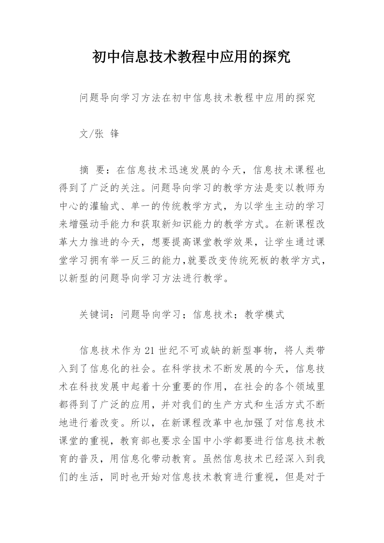 初中信息技术教程中应用的探究问题导向学习方法在初中信息技术教程中应用的探究文/张锋摘要:在信息技术迅速发展的今天,信息技术课程也得到了广泛的关注。问题导向学习的教学方法是变以教师为中心的灌输式、单一的传统教学方式,为以学生主动的学习来增强动手能力和获取新知识能力的教学方式。在新课程改革大力推进的今天,想要提高课堂教学效果,让学生通过课堂学习拥有举一反三的能力,就要改变传统死板的教学方式,以新型的问题导向学习方法进行教学。关键词:问题导向学习;信息技术;教学模式信息技术作为21世纪不可或缺的新型事物,将人类