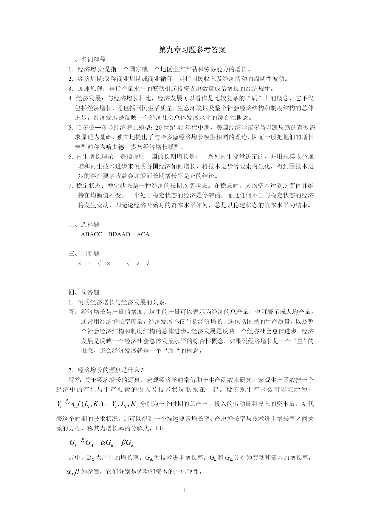 第九章习题参考答案一、名词解释1.经济增长:是指一个国家或一个地区生产产品和劳务能力的增长。2.经济周期:又称商业周期或商业循环,是指国民收入及经济活动的周期性波动。3.加速原理:是指产量水平的变动引起投资支出数量成倍增长的经济规律。4.经济发展:与经济增长相比,经济发展可以看作是比较复杂的“质”上的概念,它不仅包括经济增长,还包括国民生活质量、生态环境以及整个社会经济结构和制度结构的总体进步。经济发展是反映一个经济社会总体发展水平的综合性概念。5.哈多德—多马经济增长模型:20世纪40年代中期,美国经济