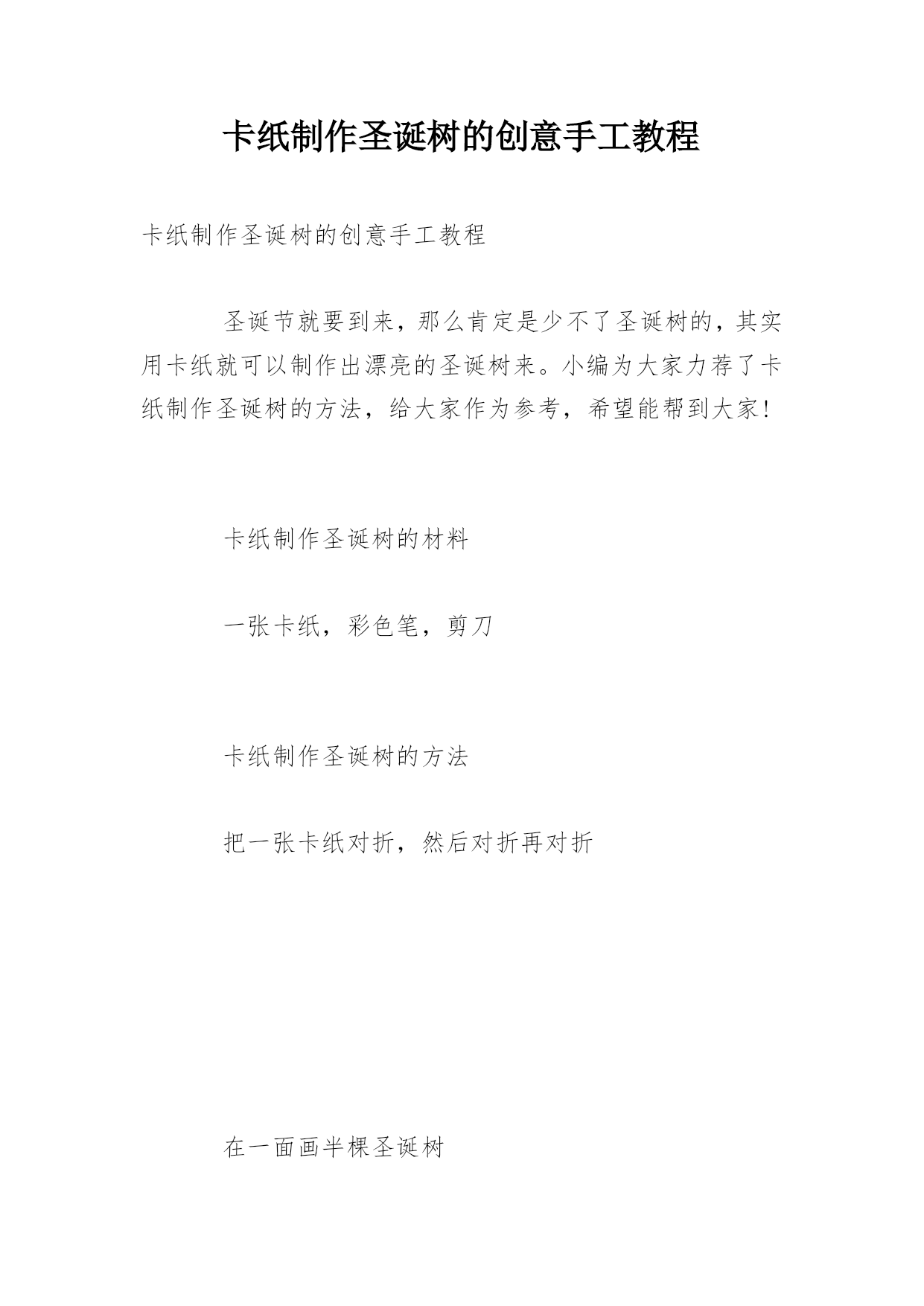 卡纸制作圣诞树的创意手工教程卡纸制作圣诞树的创意手工教程圣诞节就要到来,那么肯定是少不了圣诞树的,其实用卡纸就可以制作出漂亮的圣诞树来。小编为大家力荐了卡纸制作圣诞树的方法,给大家作为参考,希望能帮到大家!卡纸制作圣诞树的材料一张卡纸,彩色笔,剪刀卡纸制作圣诞树的方法把一张卡纸对折,然后对折再对折在一面画半棵圣诞树沿着画过的地方剪开,你就会有两片圣诞树的卡纸把一片圣诞树从树顶垂直剪到中间,另外一片从树干最底部中间垂直剪到中间然后就可以拼起来了圣诞温馨祝福语1.携手友情,将烟花释放,让生活多彩;牵手爱情,听