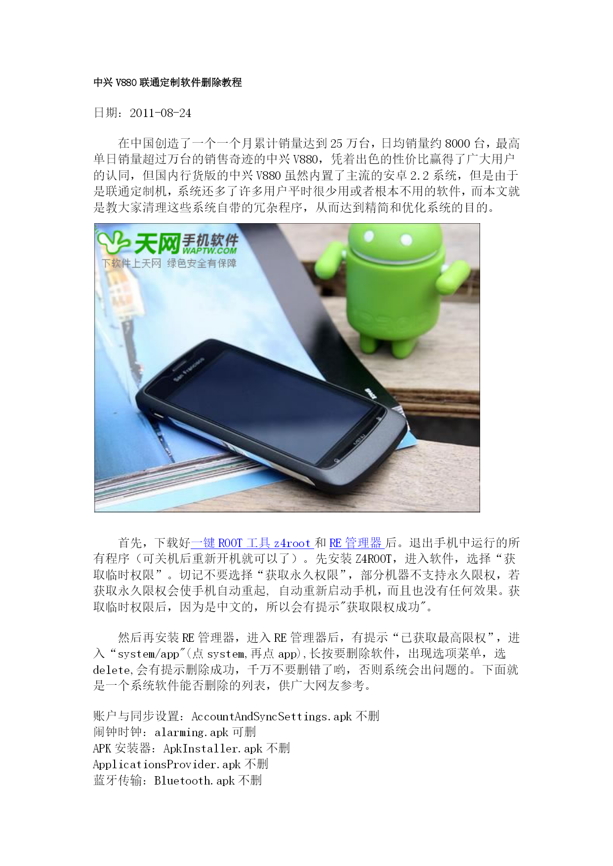 中兴V880联通定制软件删除教程日期:2011-08-24在中国创造了一个一个月累计销量达到25万台,日均销量约8000台,最高单日销量超过万台的销售奇迹的中兴V880,凭着出色的性价比赢得了广大用户的认同,但国内行货版的中兴V880虽然内置了主流的安卓2.2系统,但是由于是联通定制机,系统还多了许多用户平时很少用或者根本不用的软件,而本文就是教大家清理这些系统自带的冗杂程序,从而达到精简和优化系统的目的。首先,下载好HYPERLINK"http://android.waptw.com/pc/soft/