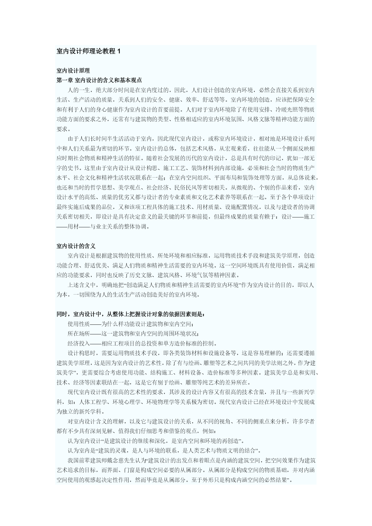 室内设计师理论教程1室内设计原理第一章室内设计的含义和基本观点人的一生,绝大部分时间是在室内度过的,因此,人们设计创造的室内环境,必然会直接关系到室内生活、生产活动的质量,关系到人们的安全、健康、效率、舒适等等。室内环境的创造,应该把保障安全和有利于人们的身心健康作为室内设计的首要前提。人们对于室内环境除了有使用安排、冷暖光照等物质功能方面的要求之外,还常有与建筑物的类型、性格相适应的室内环境氛围、风格文脉等精神功能方面的要求。由于人们长时间半生活活动于室内,因此现代室内设计,或称室内环境设计,相对地是环
