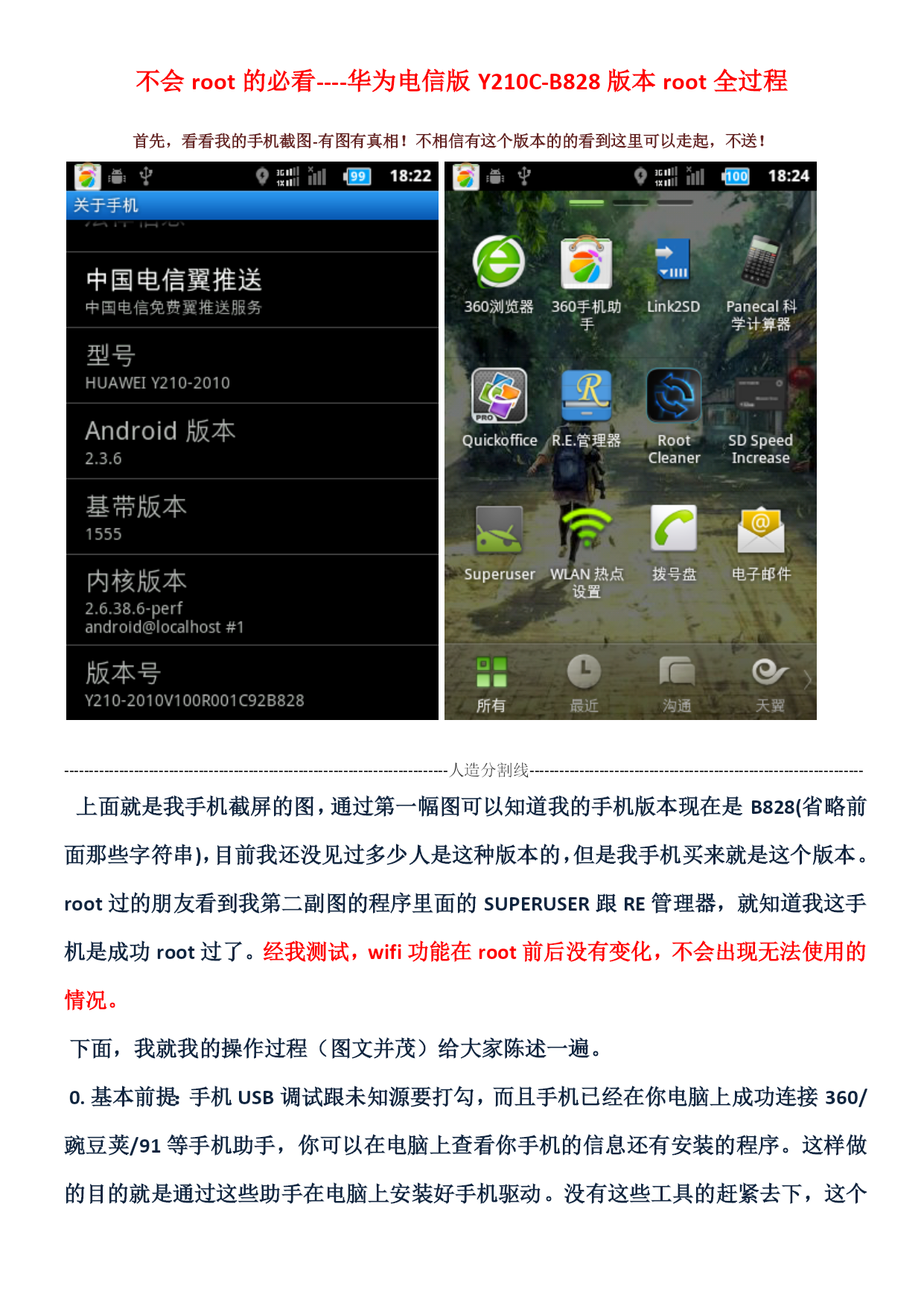 不会root的必看----华为电信版Y210C-B828版本root全过程首先,看看我的手机截图-有图有真相!不相信有这个版本的的看到这里可以走起,不送!-----------------------------------------------------------------------------人造分割线-------------------------------------------------------------------上面就是我手机截屏的图,通过第一幅图可以知道我的手机版本现