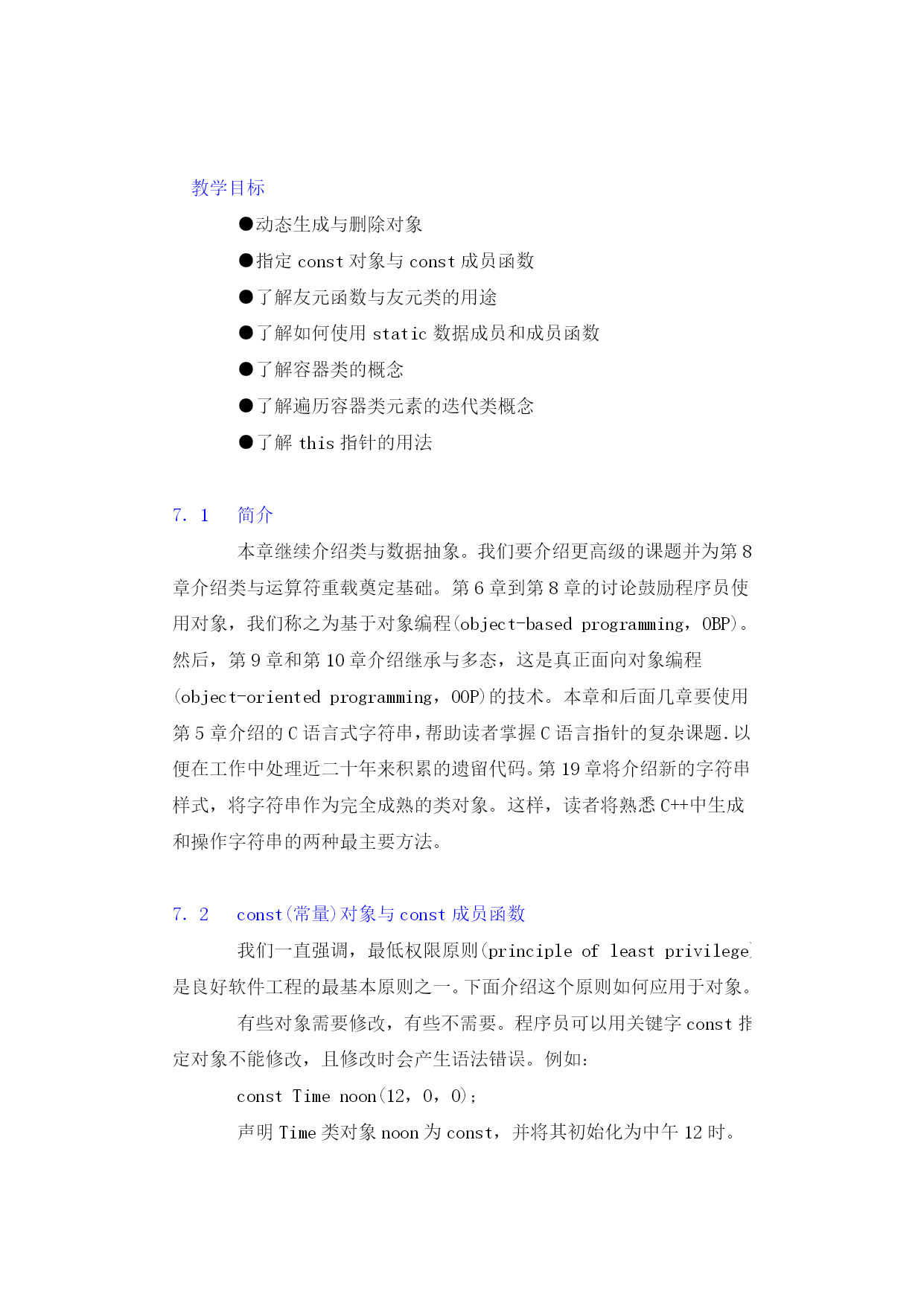 教学目标●动态生成与删除对象●指定const对象与const成员函数●了解友元函数与友元类的用途●了解如何使用static数据成员和成员函数●了解容器类的概念●了解遍历容器类元素的迭代类概念●了解this指针的用法7.1简介本章继续介绍类与数据抽象。我们要介绍更高级的课题并为第8章介绍类与运算符重载奠定基础。第6章到第8章的讨论鼓励程序员使用对象,我们称之为基于对象编程(object-basedprogramming,OBP)。然后,第9章和第10章介绍继承与多态,这是真正面向对象编程(object-or