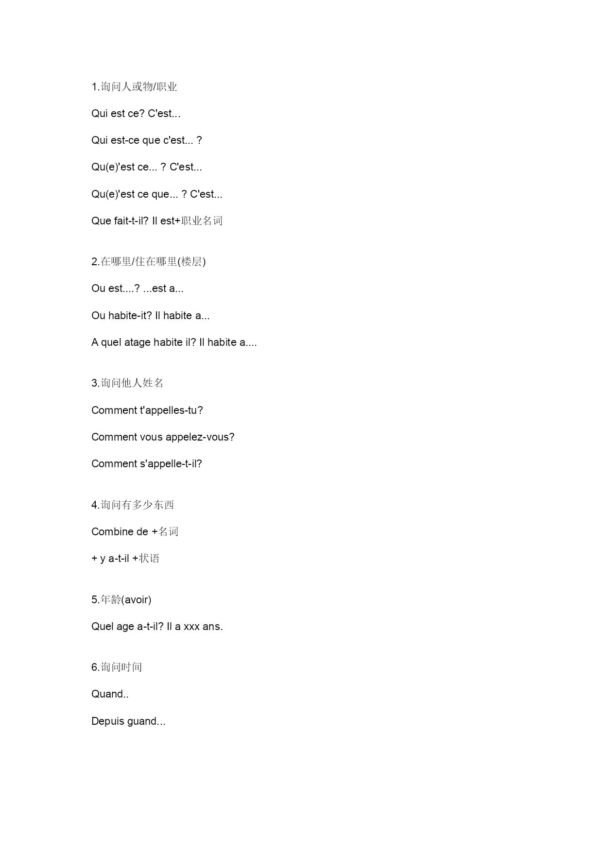 1.询问人或物/职业Quiestce?C'est...Quiest-cequec'est...?Qu(e)'estce...?C'est...Qu(e)'estceque...?C'est...Quefait-t-il?Ilest+职业名词2.在哪里/住在哪里(楼层)Ouest....?...esta...Ouhabite-it?Ilhabitea...Aquelatagehabiteil?Ilhabitea....3.询问他人姓名Commentt'appelles-tu?Commentvousappel