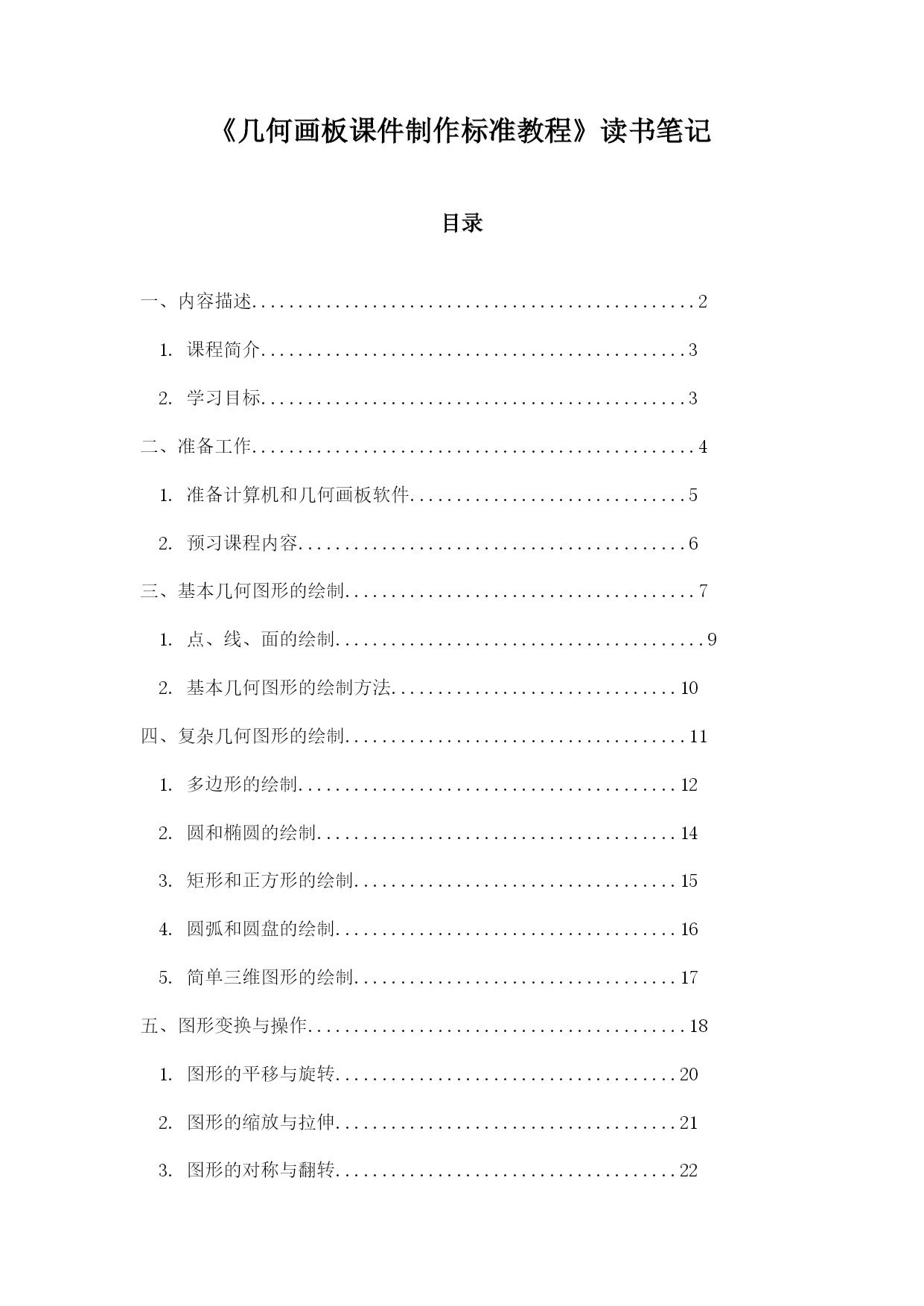 《几何画板课件制作标准教程》读书笔记目录一、内容描述................................................21.课程简介..............................................32.学习目标..............................................3二、准备工作................................................41.准备计算机和几何画板软件.....