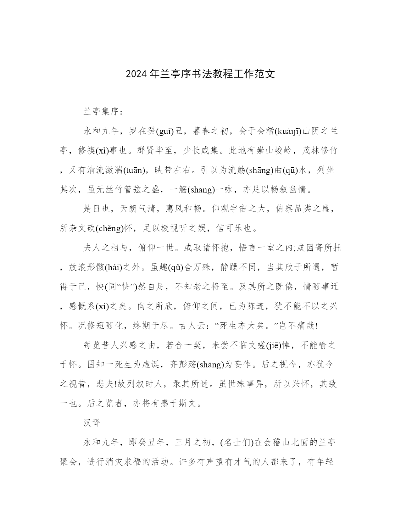 2024年兰亭序书法教程工作范文兰亭集序:永和九年,岁在癸(guǐ)丑,暮春之初,会于会稽(kuàijī)山阴之兰亭,修禊(xì)事也。群贤毕至,少长咸集。此地有崇山峻岭,茂林修竹,又有清流激湍(tuān),映带左右。引以为流觞(shāng)曲(qū)水,列坐其次,虽无丝竹管弦之盛,一觞(shang)一咏,亦足以畅叙幽情。是日也,天朗气清,惠风和畅。仰观宇宙之大,俯察品类之盛,所杂文砍(chěng)怀,足以极视听之娱,信可乐也。夫人之相与,俯仰一世。或取诸怀抱,悟言一室之内;或因寄所托,放浪形骸(hái)