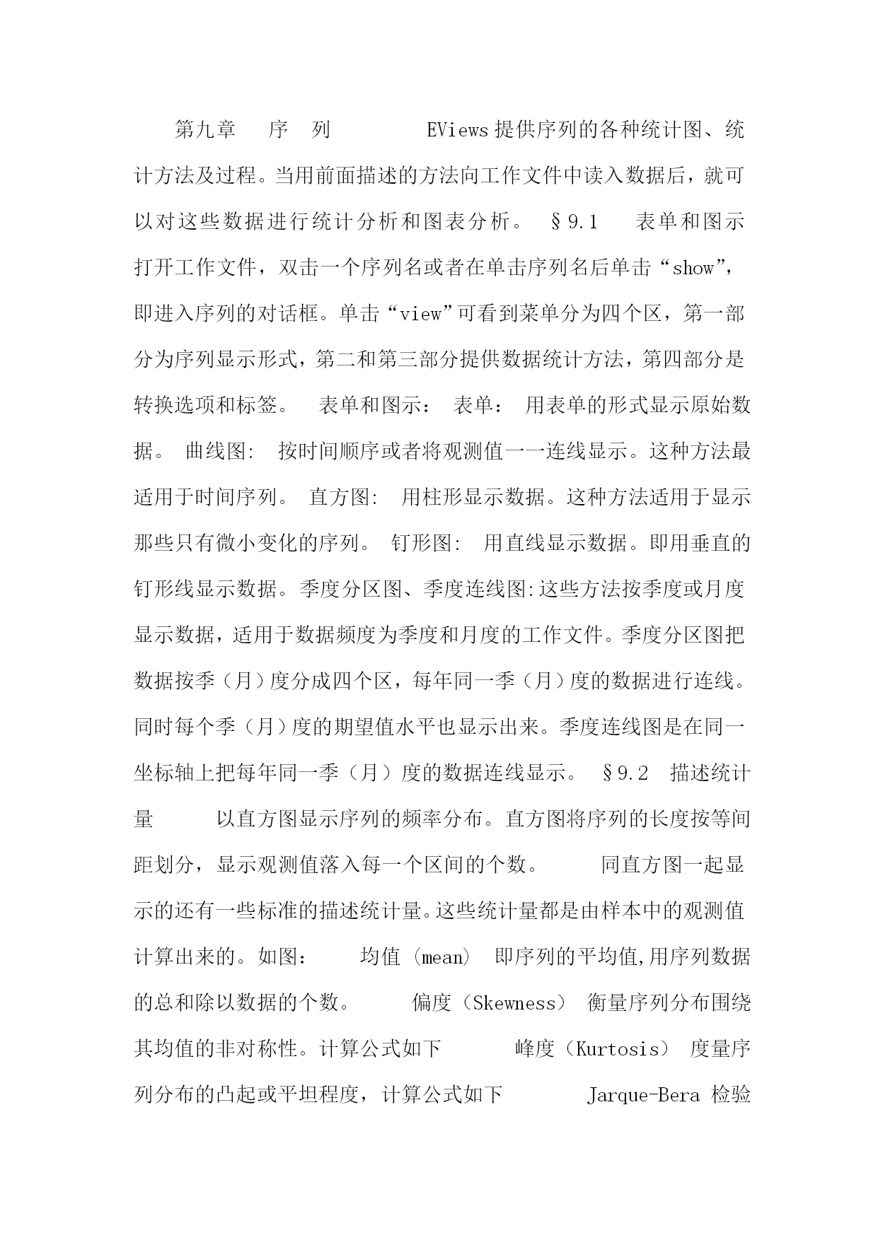 第九章序列EViews提供序列的各种统计图、统计方法及过程。当用前面描述的方法向工作文件中读入数据后,就可以对这些数据进行统计分析和图表分析。§9.1表单和图示打开工作文件,双击一个序列名或者在单击序列名后单击“show”,即进入序列的对话框。单击“view”可看到菜单分为四个区,第一部分为序列显示形式,第二和第三部分提供数据统计方法,第四部分是转换选项和标签。表单和图示:表单:用表单的形式显示原始数据。曲线图:按时间顺序或者将观测值一一连线显示。这种方法最适用于时间序列。直方图:用柱形显示数据。这种方法