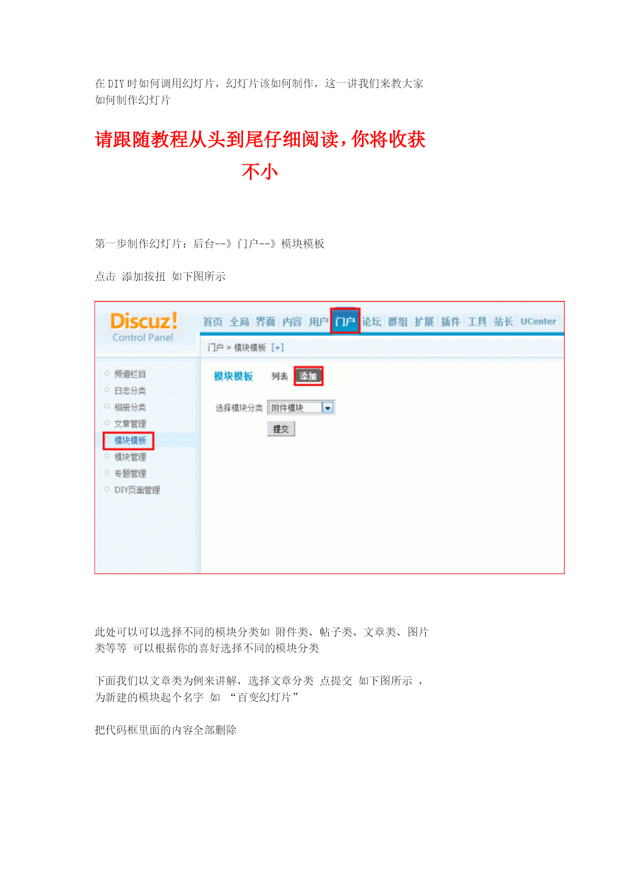 在DIY时如何调用幻灯片,幻灯片该如何制作,这一讲我们来教大家如何制作幻灯片请跟随教程从头到尾仔细阅读,你将收获不小第一步制作幻灯片:后台--》门户--》模块模板点击添加按扭如下图所示2010-9-2510:48上传HYPERLINK"http://www.discuz.net/forum.php?mod=attachment&aid=Nzk4MjIzfGQzZmM5YzUxfDEyOTk3MzY1MzV8MTU4NTg4NQ%3D%3D¬humb=yes"\o"1.gif下载次数:155"\t"