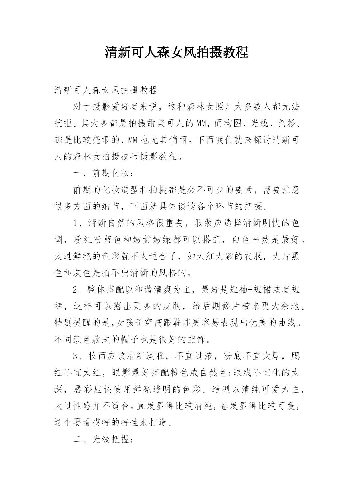 清新可人森女风拍摄教程清新可人森女风拍摄教程对于摄影爱好者来说,这种森林女照片大多数人都无法抗拒。其大多都是拍摄甜美可人的MM,而构图、光线、色彩、都是比较亮眼的,MM也尤其俏丽。下面我们就来探讨清新可人的森林女拍摄技巧摄影教程。一、前期化妆:前期的化妆造型和拍摄都是必不可少的要素,需要注意很多方面的细节,下面就具体谈谈各个环节的把握。1、清新自然的风格很重要,服装应选择清新明快的色调,粉红粉蓝色和嫩黄嫩绿都可以搭配,白色当然是最好。太过鲜艳的色彩就不太适合了,如大红大紫的衣服,大片黑色和灰色是拍不出清新