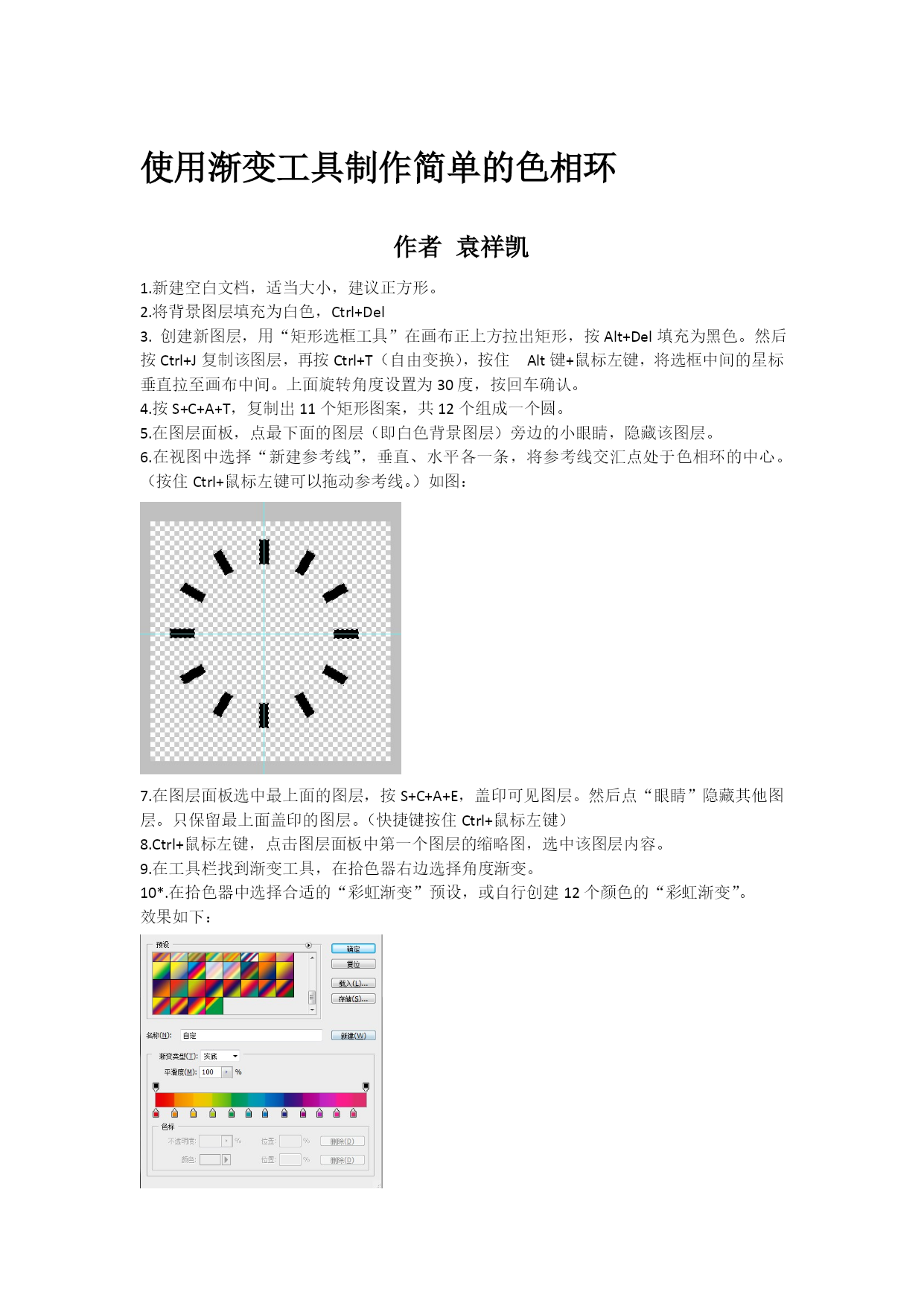 使用渐变工具制作简单的色相环作者袁祥凯1.新建空白文档,适当大小,建议正方形。2.将背景图层填充为白色,Ctrl+Del3.创建新图层,用“矩形选框工具”在画布正上方拉出矩形,按Alt+Del填充为黑色。然后按Ctrl+J复制该图层,再按Ctrl+T(自由变换),按住Alt键+鼠标左键,将选框中间的星标垂直拉至画布中间。上面旋转角度设置为30度,按回车确认。4.按S+C+A+T,复制出11个矩形图案,共12个组成一个圆。5.在图层面板,点最下面的图层(即白色背景图层)旁边的小眼睛,隐藏该图层。6.在视图中