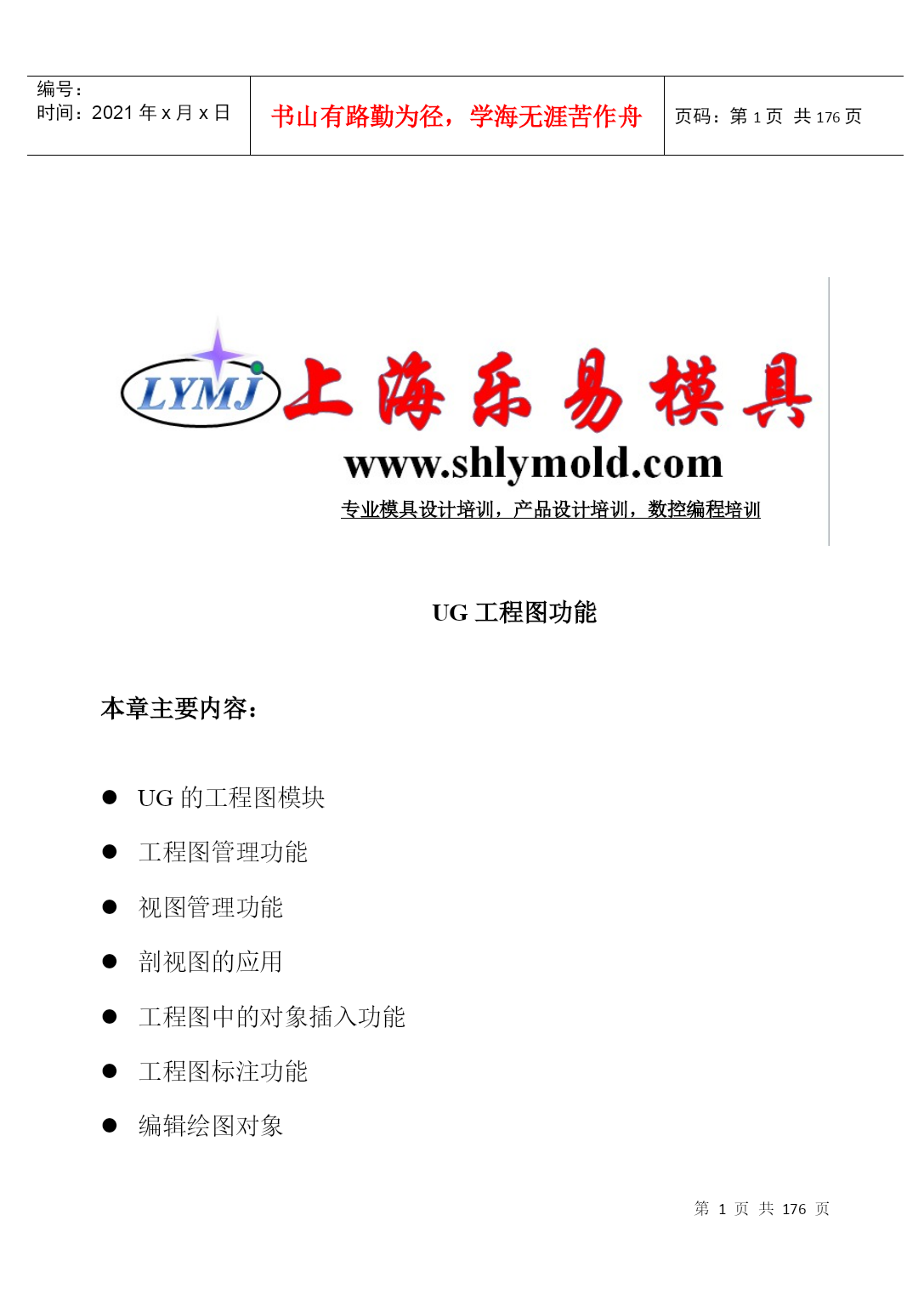 编号:时间:2021年x月x日书山有路勤为径,学海无涯苦作舟页码:第PAGE176页共NUMPAGES176页第PAGE\*MERGEFORMAT176页共NUMPAGES\*MERGEFORMAT176页专业模具设计培训,产品设计培训,数控编程培训UG工程图功能本章主要内容:UG的工程图模块工程图管理功能视图管理功能剖视图的应用工程图中的对象插入功能工程图标注功能编辑绘图对象工程图参数的设置工程图的其他功能本章实例6.1UG的工程图模块利用UG的Modeling(实体建模)功能创