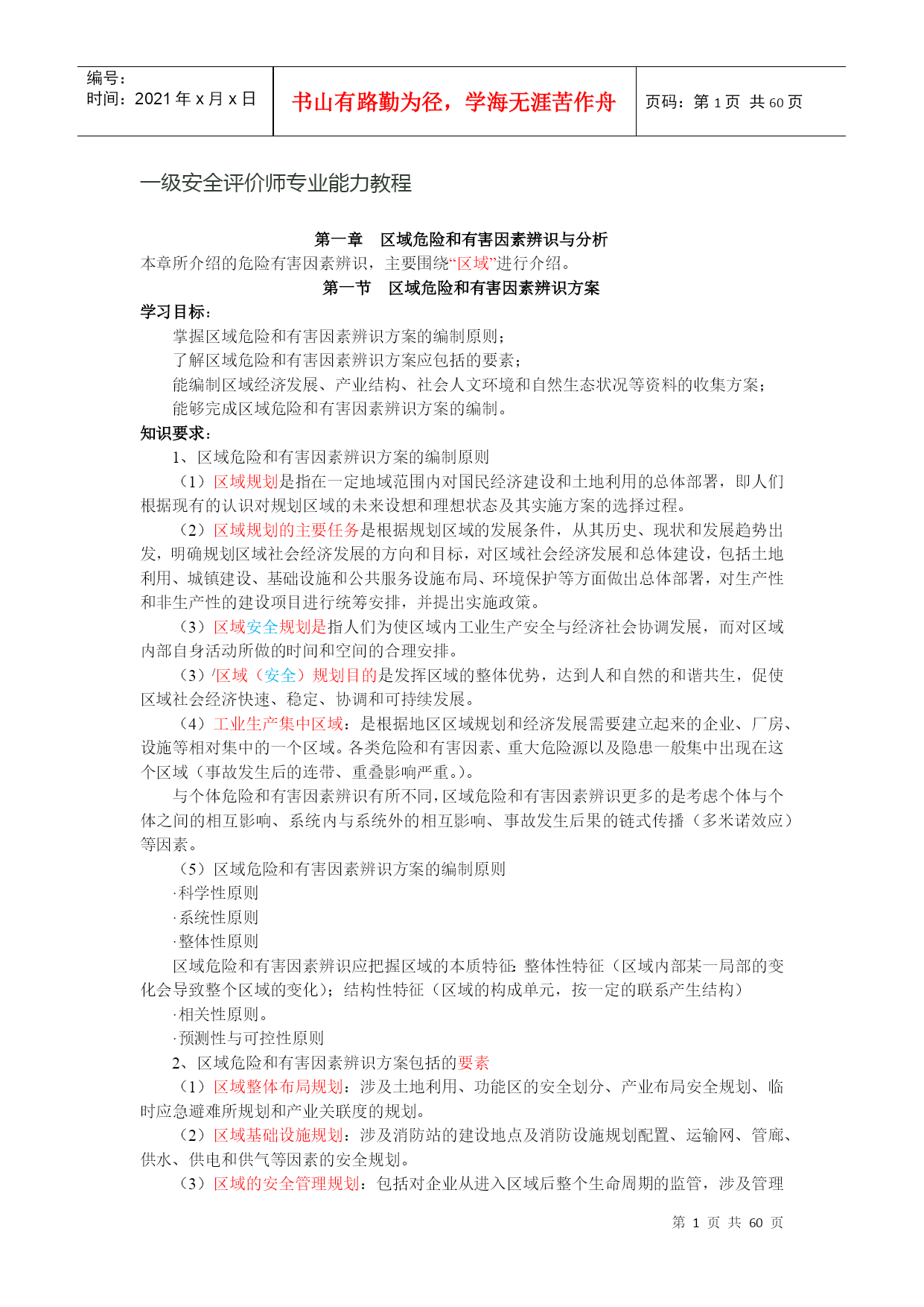 编号:时间:2021年x月x日书山有路勤为径,学海无涯苦作舟页码:第PAGE60页共NUMPAGES60页第PAGE\*MERGEFORMAT60页共NUMPAGES\*MERGEFORMAT60页一级安全评价师专业能力教程第一章区域危险和有害因素辨识与分析本章所介绍的危险有害因素辨识,主要围绕“区域”进行介绍。第一节区域危险和有害因素辨识方案学习目标:掌握区域危险和有害因素辨识方案的编制原则;了解区域危险和有害因素辨识方案应包括的要素;能编制区域经济发展、产业结构、社会人文环境和