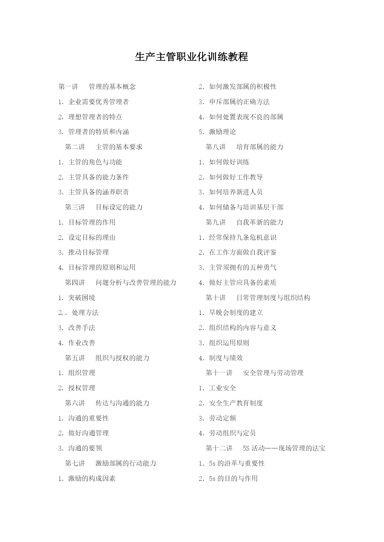 生产主管职业化训练教程第一讲管理的基本概念1.企业需要优秀管理者2.理想管理者的特点3.管理者的特质和内涵第二讲主管的基本要求1.主管的角色与功能2.主管具备的能力条件3.主管具备的涵养职责第三讲目标设定的能力1.目标管理的作用2.设定目标的理由3.推动目标管理4.目标管理的原则和运用第四讲问题分析与改善管理的能力1.突破困境2..处理方法3.改善手法4.作业改善第五讲组织与授权的能力1.组织管理2.授权管理第六讲传达与沟通的能力1.沟通的重要性2.做好沟通管理3.沟通的要领第七讲激励部属的行动能力1.激
