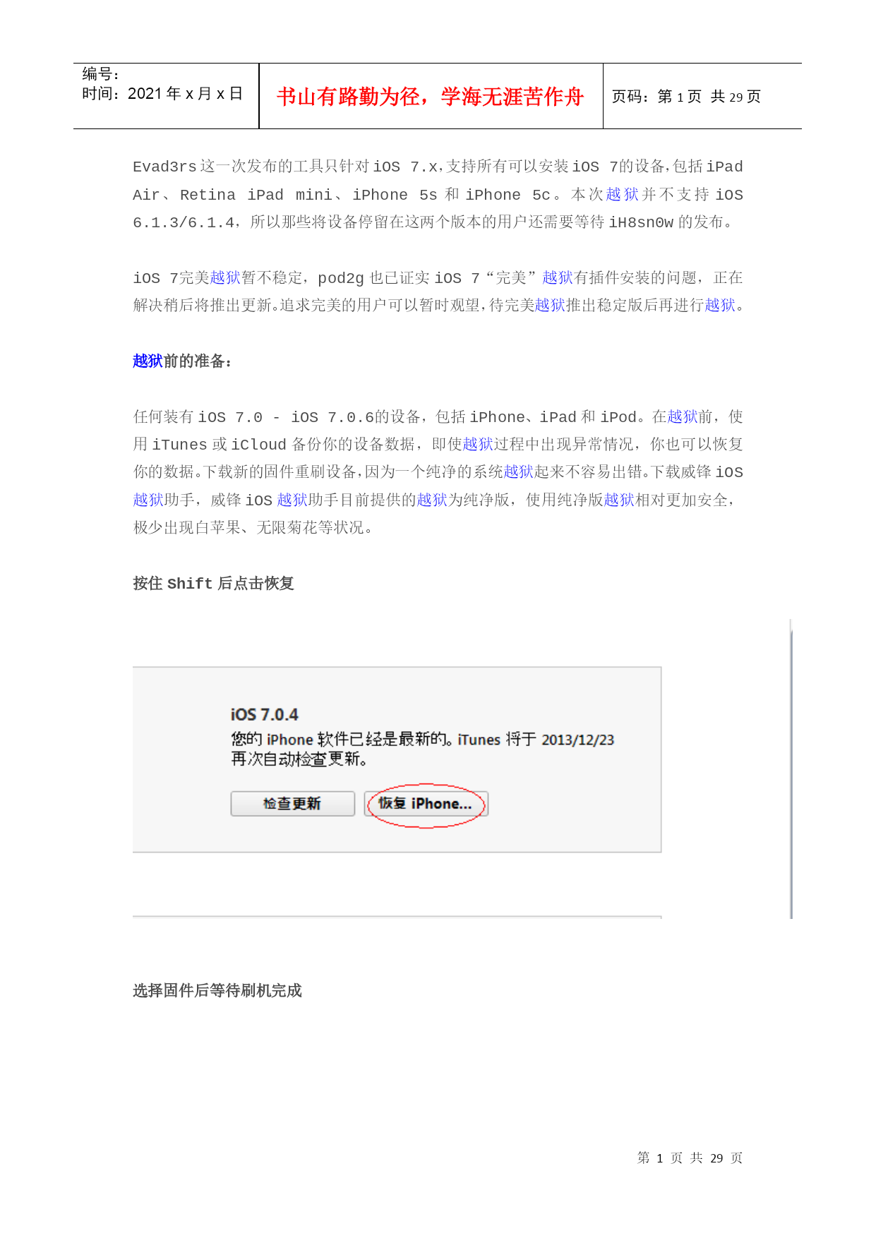 编号:时间:2021年x月x日书山有路勤为径,学海无涯苦作舟页码:第PAGE29页共NUMPAGES29页第PAGE\*MERGEFORMAT29页共NUMPAGES\*MERGEFORMAT29页Evad3rs这一次发布的工具只针对iOS7.x,支持所有可以安装iOS7的设备,包括iPadAir、RetinaiPadmini、iPhone5s和iPhone5c。本次HYPERLINK""越狱并不支持iOS6.1.3/6.1.4,所以那些将设备停留在这两个版本的用户还需要等待