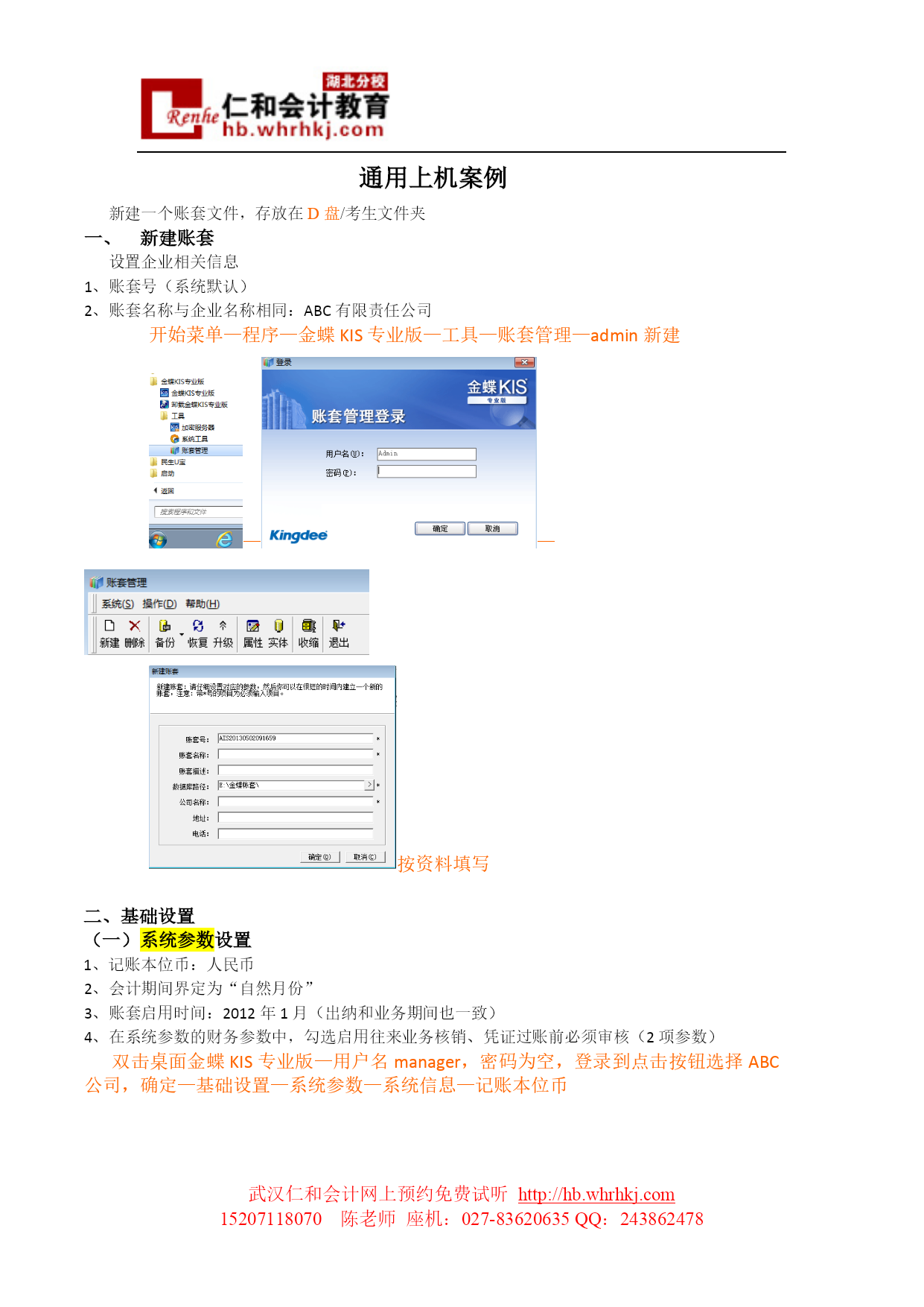 武汉仁和会计网上预约免费试听HYPERLINK"http://hb.whrhkj.com"http://hb.whrhkj.com15207118070陈老师座机:027-83620635QQ:243862478通用上机案例新建一个账套文件,存放在D盘/考生文件夹新建账套设置企业相关信息1、账套号(系统默认)2、账套名称与企业名称相同:ABC有限责任公司开始菜单—程序—金蝶KIS专业版—工具—账套管理—admin新建——按资料填写二、基础设置(一)系统参数设置1、记账本位币:人民币2、会计期间界定为
