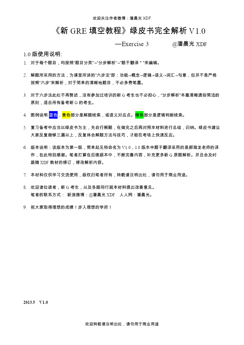 欢迎关注作者微博:潘晨光XDF《新GRE填空教程》绿皮书完全解析V1.0—Exercise3@潘晨光XDF1.0版使用说明:1.对于每个题目,均按照“题目分类”→“分步解析”→“题干翻译"”来编辑。2.解题所采用的方法,为课堂所讲的”六步法“即:功能→概念→逻辑→语义→词汇→句意,但并不是严格按照“六步”来解析,对于简单的清晰地题目,不必多费笔墨。3.对于六步法此处不再赘述,没有参加过培训的新G考生也不必担心,“分步解析“本着清晰通俗简洁的原则,适合所有备考新G的考生。4.图例说明:蓝色,黄色部分是解题线