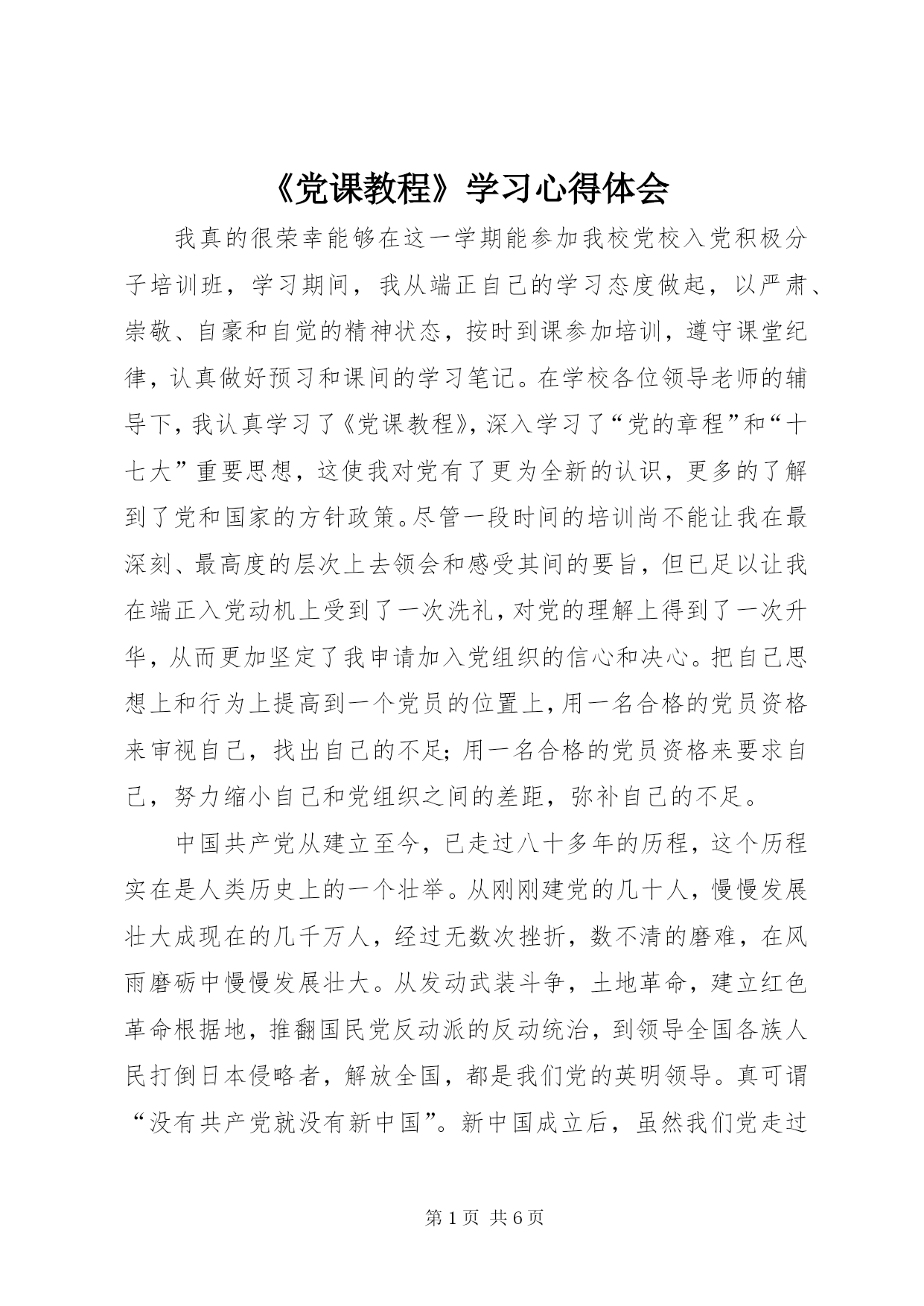 第PAGE\*Arabic\*MERGEFORMAT6页共NUMPAGES\*MERGEFORMAT6页《党课教程》学习心得体会我真的很荣幸能够在这一学期能参加我校党校入党积极分子培训班,学习期间,我从端正自己的学习态度做起,以严肃、崇敬、自豪和自觉的精神状态,按时到课参加培训,遵守课堂纪律,认真做好预习和课间的学习笔记。在学校各位领导老师的辅导下,我认真学习了《党课教程》,深入学习了“党的章程”和“十七大”重要思想,这使我对党有了更为全新的认识,更多的了解到了党和国家的方针政策。尽管一段时间