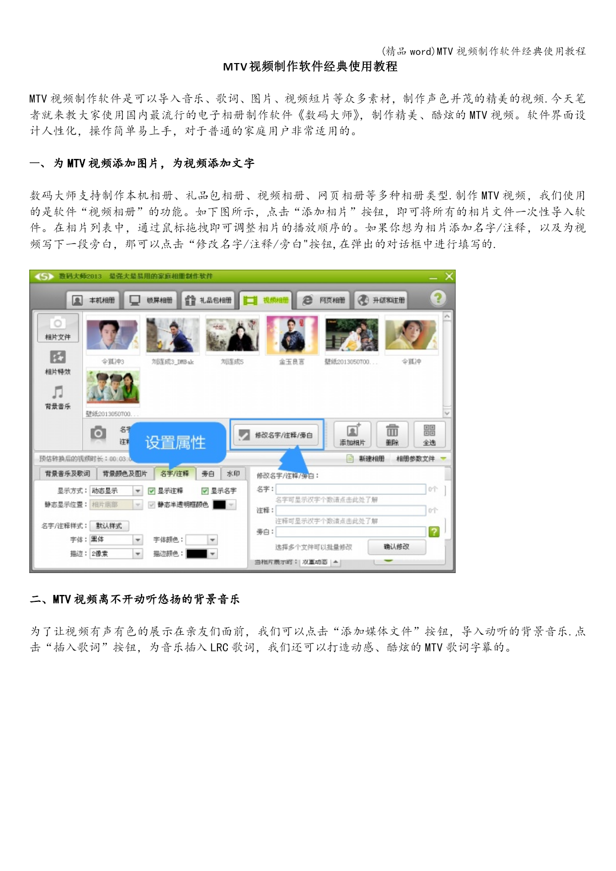 (精品word)MTV视频制作软件经典使用教程(精品word)MTV视频制作软件经典使用教程(精品word)MTV视频制作软件经典使用教程MTV视频制作软件经典使用教程MTV视频制作软件是可以导入音乐、歌词、图片、视频短片等众多素材,制作声色并茂的精美的视频.今天笔者就来教大家使用国内最流行的电子相册制作软件《数码大师》,制作精美、酷炫的MTV视频。软件界面设计人性化,操作简单易上手,对于普通的家庭用户非常适用的。为MTV视频添加图片,为视频添加文字数码大师支持制作本机相册、礼品包相册、视频相册、网页相册