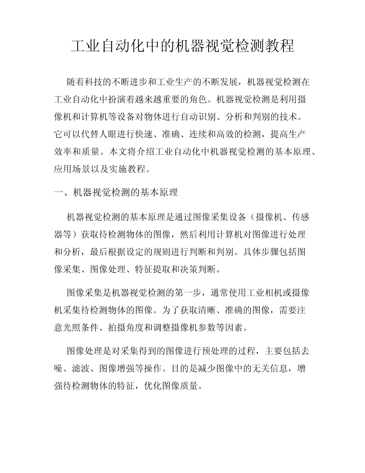 工业自动化中的机器视觉检测教程随着科技的不断进步和工业生产的不断发展,机器视觉检测在工业自动化中扮演着越来越重要的角色。机器视觉检测是利用摄像机和计算机等设备对物体进行自动识别、分析和判别的技术。它可以代替人眼进行快速、准确、连续和高效的检测,提高生产效率和质量。本文将介绍工业自动化中机器视觉检测的基本原理、应用场景以及实施教程。一、机器视觉检测的基本原理机器视觉检测的基本原理是通过图像采集设备(摄像机、传感器等)获取待检测物体的图像,然后利用计算机对图像进行处理和分析,最后根据设定的规则进行判断和判别。