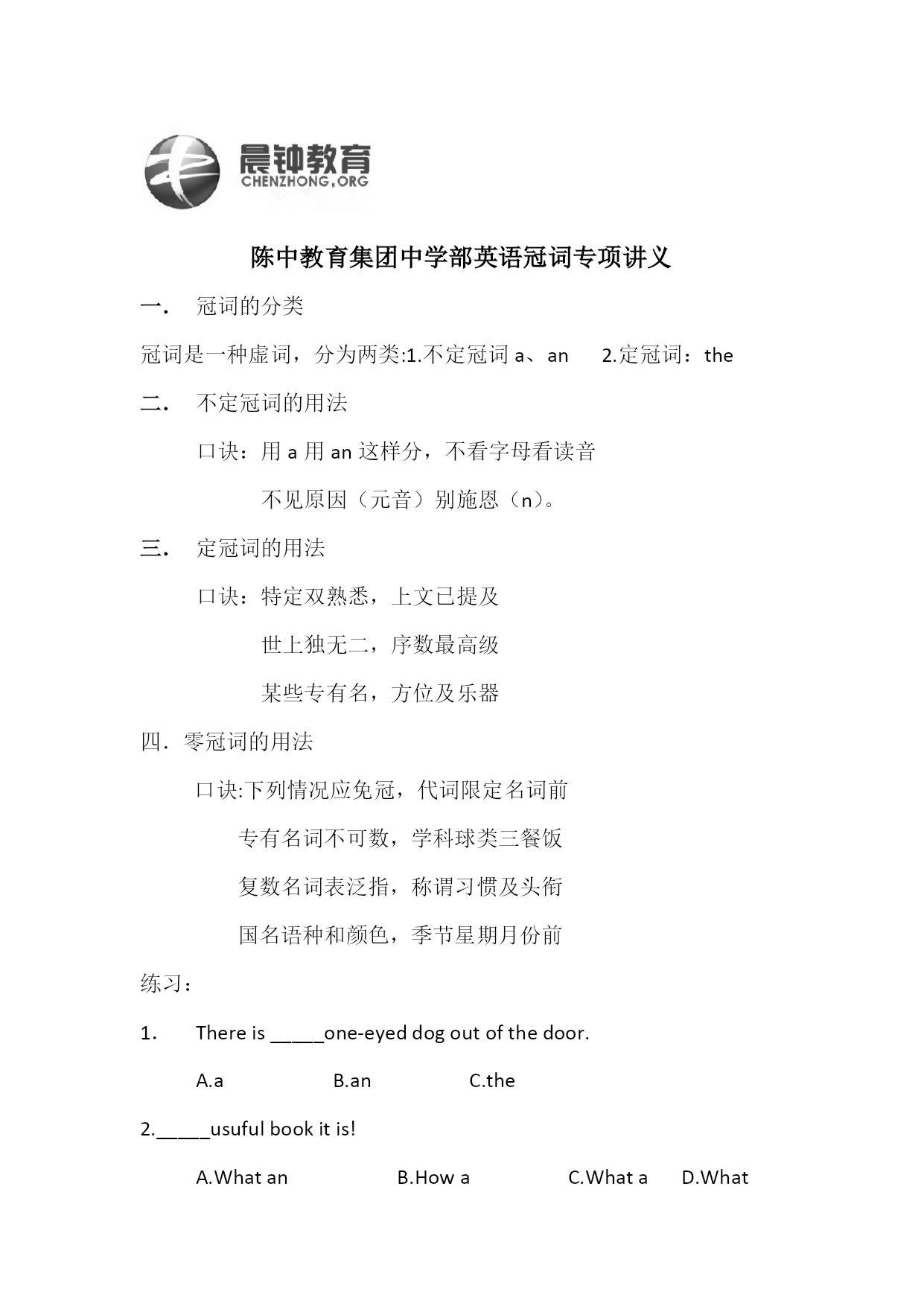 陈中教育集团中学部英语冠词专项讲义.doc