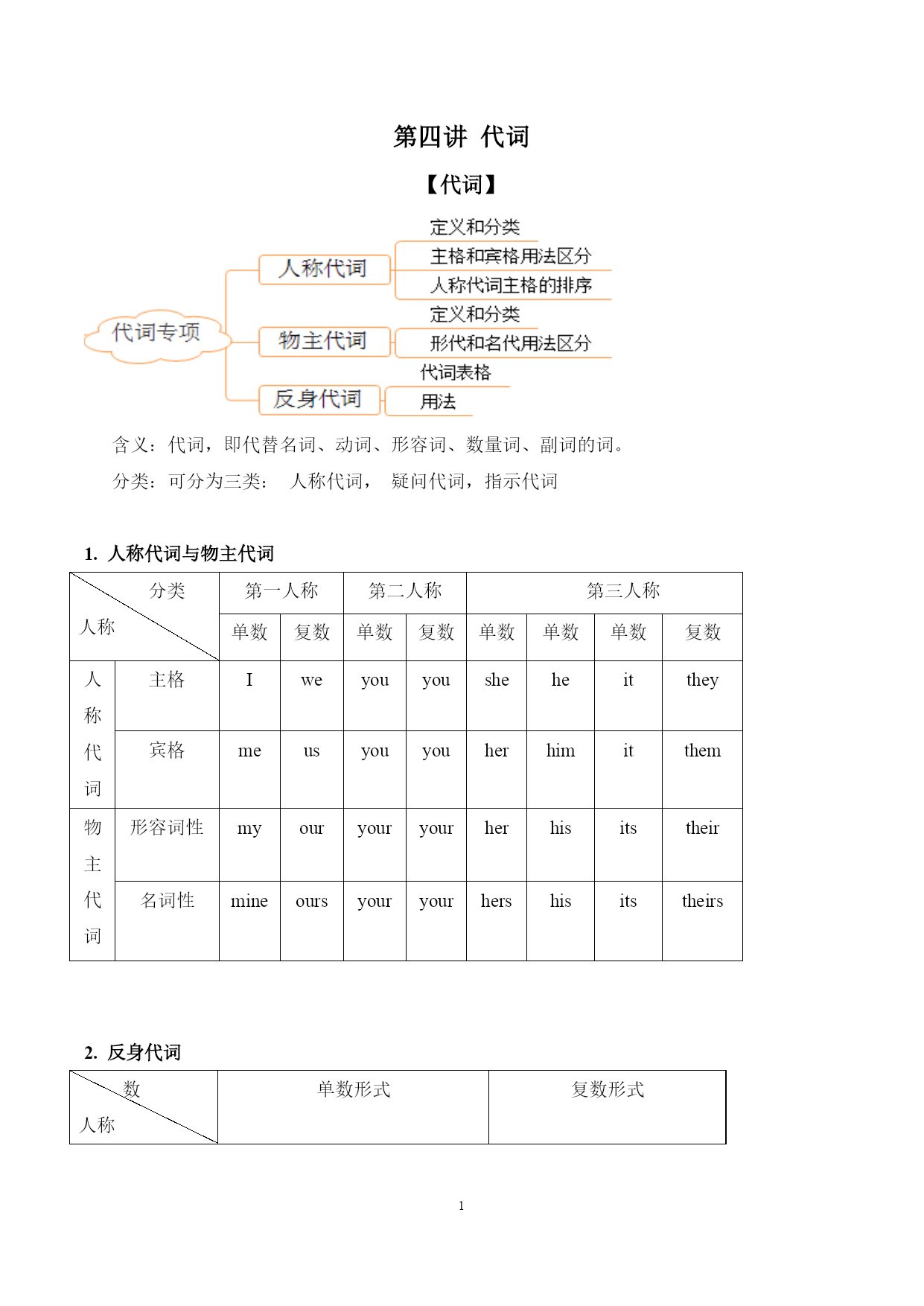 PAGE\*MERGEFORMAT15ADDINCNKISM.UserStyle第四讲代词【代词】含义:代词,即代替HYPERLINK""\t"_blank"名词、HYPERLINK""\t"_blank"动词、HYPERLINK""\t"_blank"形容词、HYPERLINK""\t"_blank"数量词、HYPERLINK""\t"_blank"副词的词。分类:可分为三类:HYPERLINK""\t"_blank"人称代词,HYPERLINK""\t