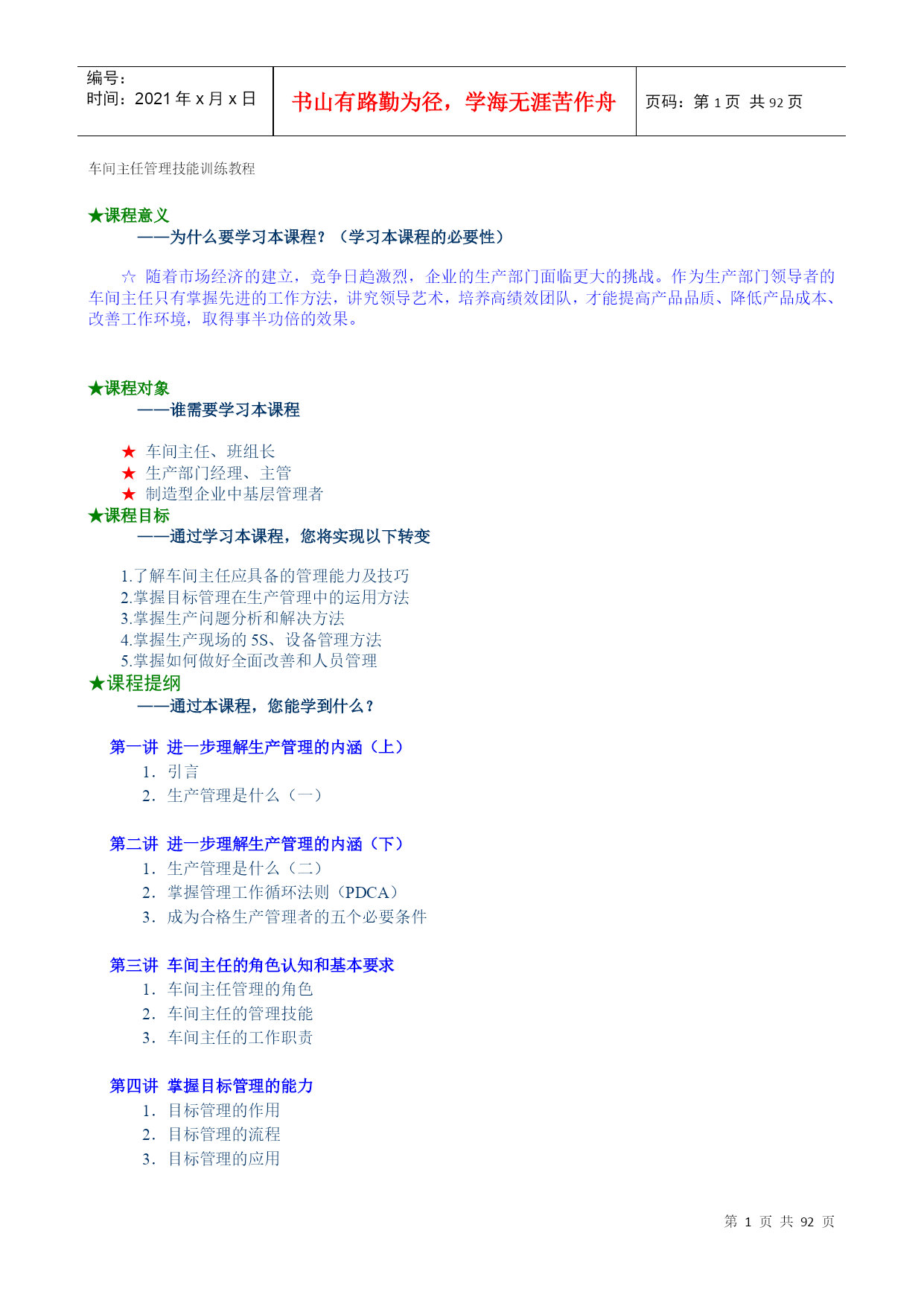 编号:时间:2021年x月x日书山有路勤为径,学海无涯苦作舟页码:第PAGE92页共NUMPAGES92页第PAGE\*MERGEFORMAT92页共NUMPAGES\*MERGEFORMAT92页车间主任管理技能训练教程★课程意义——为什么要学习本课程?(学习本课程的必要性)☆随着市场经济的建立,竞争日趋激烈,企业的生产部门面临更大的挑战。作为生产部门领导者的车间主任只有掌握先进的工作方法,讲究领导艺术,培养高绩效团队,才能提高产品品质、降低产品成本、改善工作环境,取得事半功倍的
