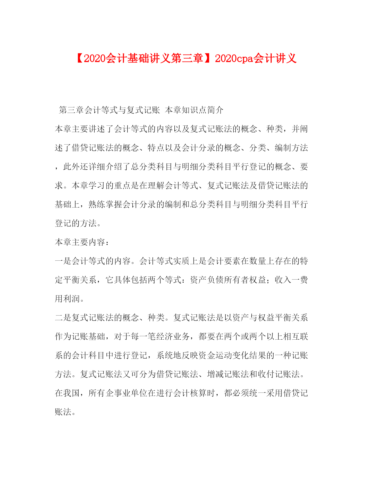 PAGE此资料由网络收集而来,如有侵权请告知上传者立即删除。资料共分享,我们负责传递知识。【2020会计基础讲义第三章】2020cpa会计讲义第三章会计等式与复式记账本章知识点简介本章主要讲述了会计等式的内容以及复式记账法的概念、种类,并阐述了借贷记账法的概念、特点以及会计分录的概念、分类、编制方法,此外还详细介绍了总分类科目与明细分类科目平行登记的概念、要求。本章学习的重点是在理解会计等式、复式记账法及借贷记账法的基础上,熟练掌握会计分录的编制和总分类科目与明细分类科目平行登记的方法。本章主要内容