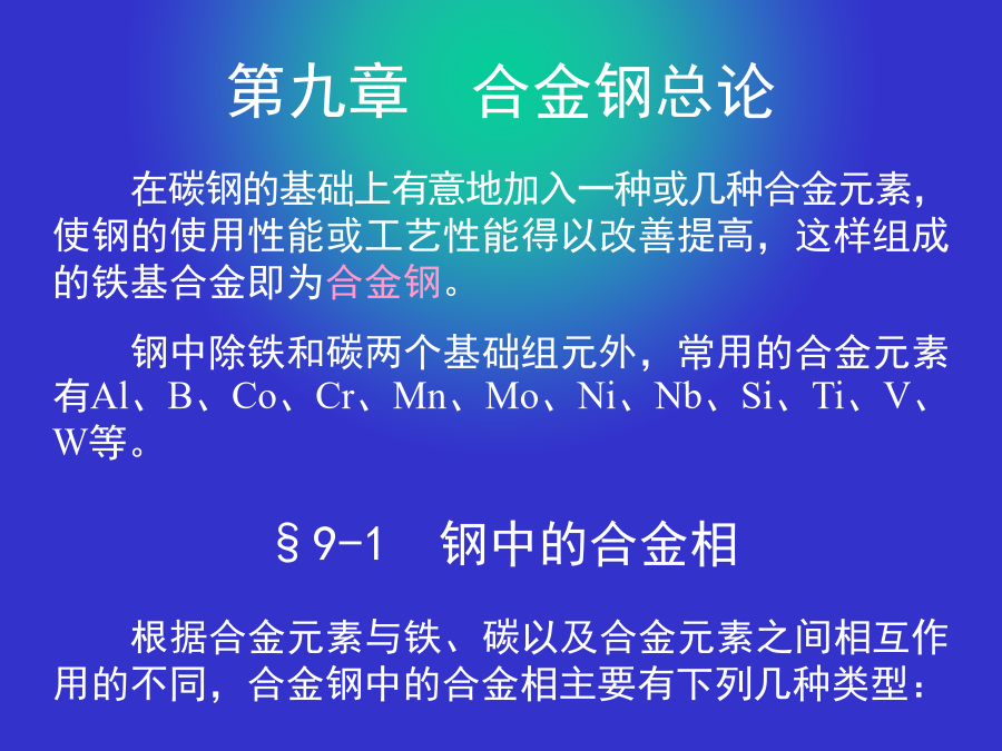 第九章合金钢总论一、铁基固溶体α-Feγ-Feδ-Fe在常用的合金元素中,除C、N、B与铁形成间隙固溶体外,其余元素均与铁形成代位固溶体。图9-1铁碳相图(2)碳化物形成元素:碳化物形成元素都具有一个未填满的d电子层,d电子层愈是不满,形成碳化物的能力就愈强,即和碳的亲和力愈大,从而形成的碳化物也就愈稳定。据此,可将合金元素形成碳化物的能力由强至弱排列如下:Ti、Zr、V、Ta、Nb、W、Mo、Cr、Mn、Fe。一般把Ti、Zr、V、Ta、Nb算作强碳化物形成元素,W、Mo算作中强碳化物形成元素,Cr、M