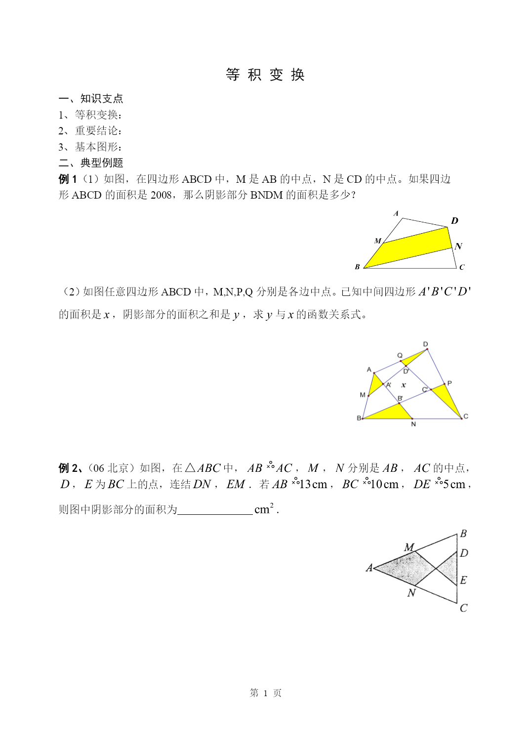 第页等积变换一、知识支点1、等积变换:2、重要结论:3、基本图形:二、典型例题例1(1)如图,在四边形ABCD中,M是AB的中点,N是CD的中点。如果四边形ABCD的面积是2008,那么阴影部分BNDM的面积是多少?(2)如图任意四边形ABCD中,M,N,P,Q分别是各边中点。已知中间四边形的面积是,阴影部分的面积之和是,求与的函数关系式。例2、(06北京)如图,在中,,,分别是,的中点,,为上的点,连结,.若,,,则图中阴影部分的面积为.例3、(1)如图三角形ABC,过A点的中线能把三角形分成面积相同的
