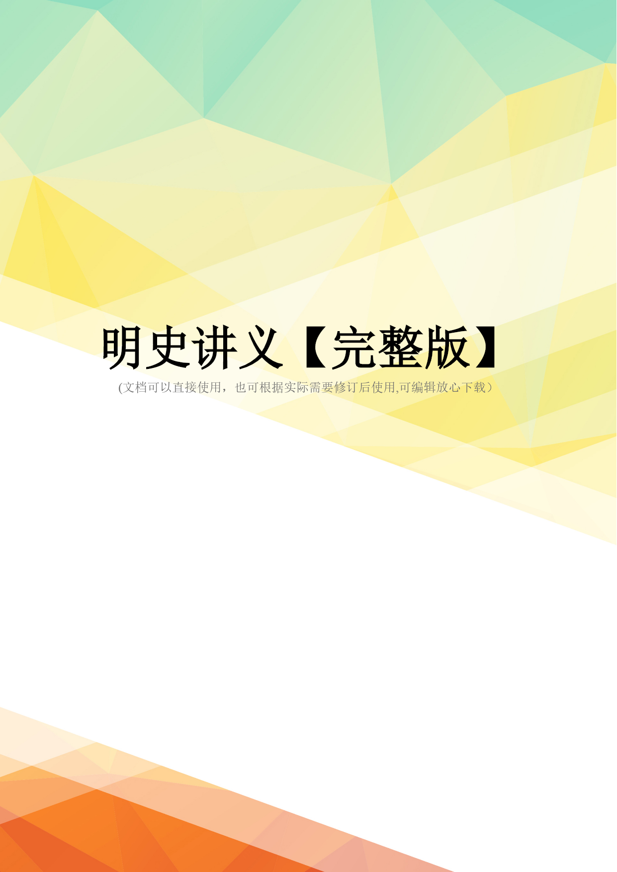明史讲义【完整版】(文档可以直接使用,也可根据实际需要修订后使用,可编辑放心下载)明史讲义〔1368——1445〕明帝系:太祖〔朱元璋,洪武31年〕—→建文帝〔朱允文,建文4年〕—→成祖〔朱棣,永乐22年〕—→仁宗〔朱高炽,洪熙元年〕—→宣宗〔朱瞻基,宣德10年〕—→英宗〔朱祁镇,正统14年、天顺8年〕—→代宗〔朱祁鈺,景泰7年〕—→宪宗〔朱见深,成化23年〕—→孝宗〔朱祐樘,弘治18年〕—→武宗〔朱厚照,正德16年〕—→世宗〔朱厚熜,嘉靖45年〕—→穆宗〔朱载垕,隆庆6年〕—→神宗〔朱翊钧,万历48年〕