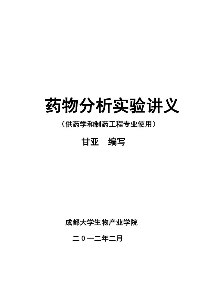 药物分析实验讲义(供药学和制药工程专业使用)甘亚编写成都大学生物产业学院二0一二年二月《药物分析实验》课程大纲(一)本课程实验总体介绍1、本课程实验的任务:《药物分析实验》是《药物分析》课程中重要组成部分,要求学生系统地学习中国药典常用分析方法的基本原理和实验技术,熟练地掌握药物分析中包括样品处理、药物鉴别、杂质检查和含量测定等各项实验技能以及常用分析仪器的正确使用方法,培养学生严谨的科学态度和独立的药物分析能力,从而能熟练地借助药典完成药品质量检验工作。实验课教学应做到:1)认真验证实验教材指定的药物分