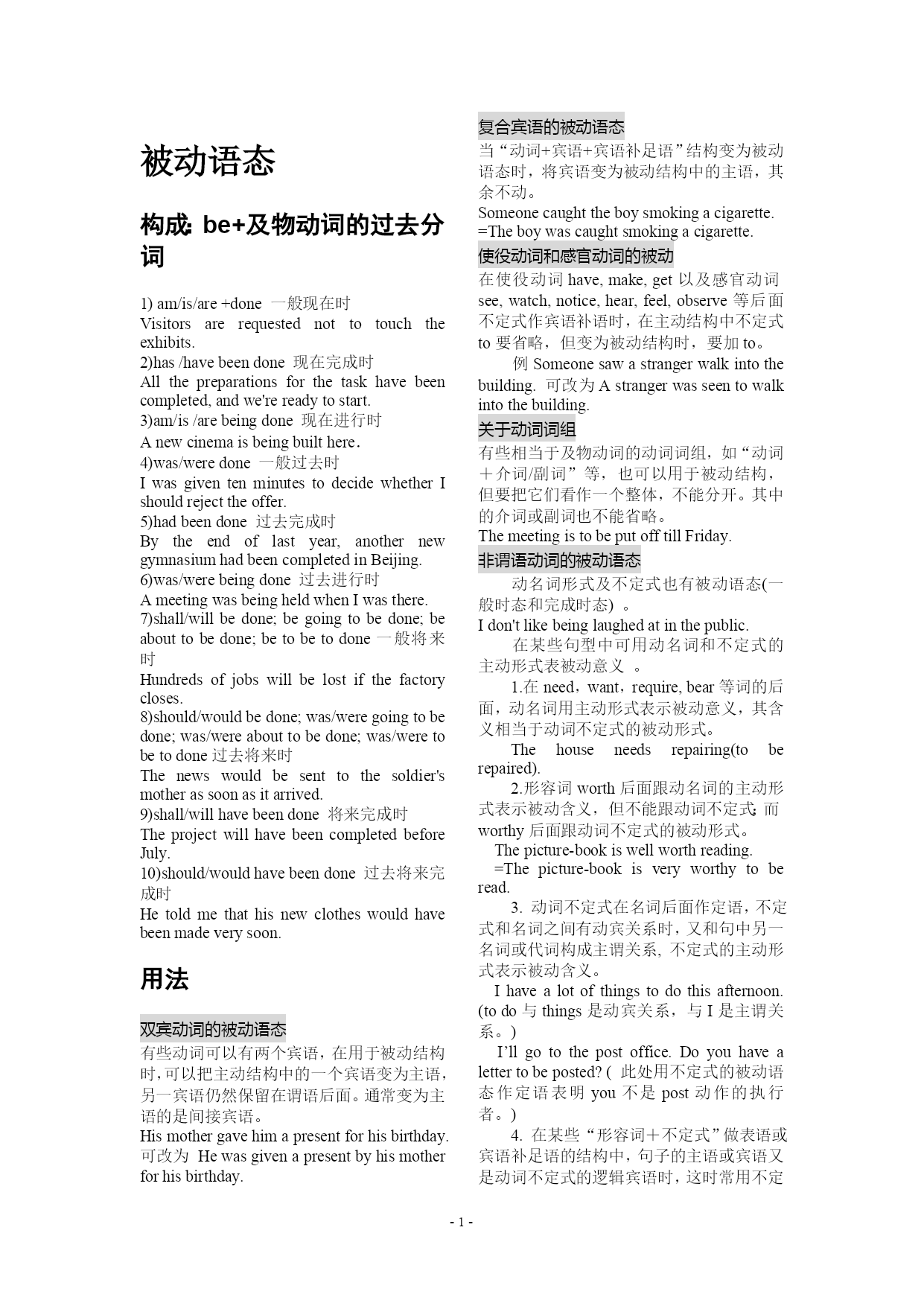 PAGEPAGE-4-被动语态构成:be+及物动词的过去分词1)am/is/are+done一般现在时Visitorsarerequestednottotouchtheexhibits.2)has/havebeendone现在完成时Allthepreparationsforthetaskhavebeencompleted,andwe'rereadytostart.3)am/is/arebeingdone现在进行时Anewcinemaisbeingbuilthere.4)was/weredone