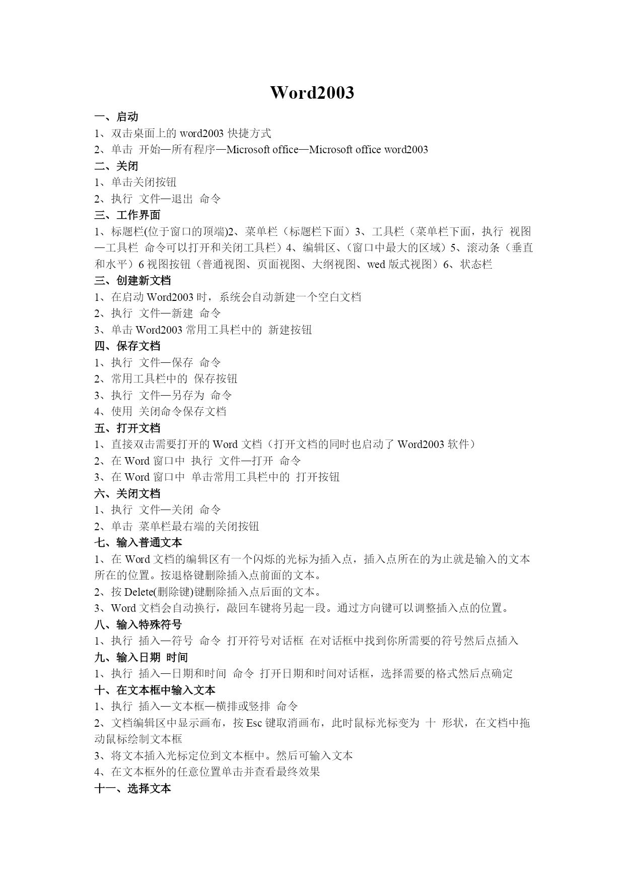 Word2003一、启动1、双击桌面上的word2003快捷方式2、单击开始—所有程序—Microsoftoffice—Microsoftofficeword2003二、关闭1、单击关闭按钮2、执行文件—退出命令三、工作界面1、标题栏(位于窗口的顶端)2、菜单栏(标题栏下面)3、工具栏(菜单栏下面,执行视图—工具栏命令可以打开和关闭工具栏)4、编辑区、(窗口中最大的区域)5、滚动条(垂直和水平)6视图按钮(普通视图、页面视图、大纲视图、wed版式视图)6、状态栏三、创建新文档1、在启动Word2003时