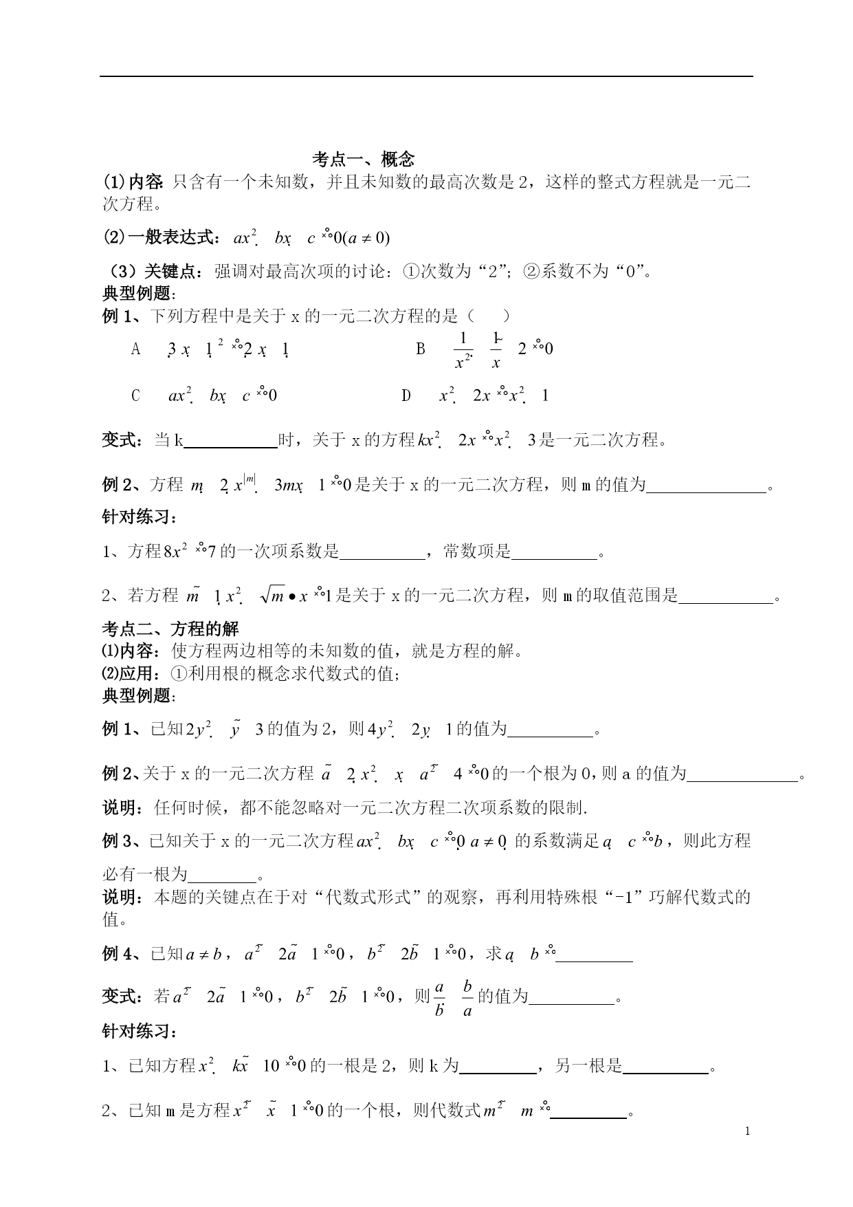 PAGEPAGE9考点一、概念(1)内容:只含有一个未知数,并且未知数的最高次数是2,这样的整式方程就是一元二次方程。(2)一般表达式:(3)关键点:强调对最高次项的讨论:①次数为“2”;②系数不为“0”。典型例题:例1、下列方程中是关于x的一元二次方程的是()ABCD变式:当k时,关于x的方程是一元二次方程。例2、方程是关于x的一元二次方程,则m的值为。针对练习:1、方程的一次项系数是,常数项是。2、若方程是关于x的一元二次方程,则m的取值范围是。考点二、方程的解⑴内容:使方程两边相等的未知