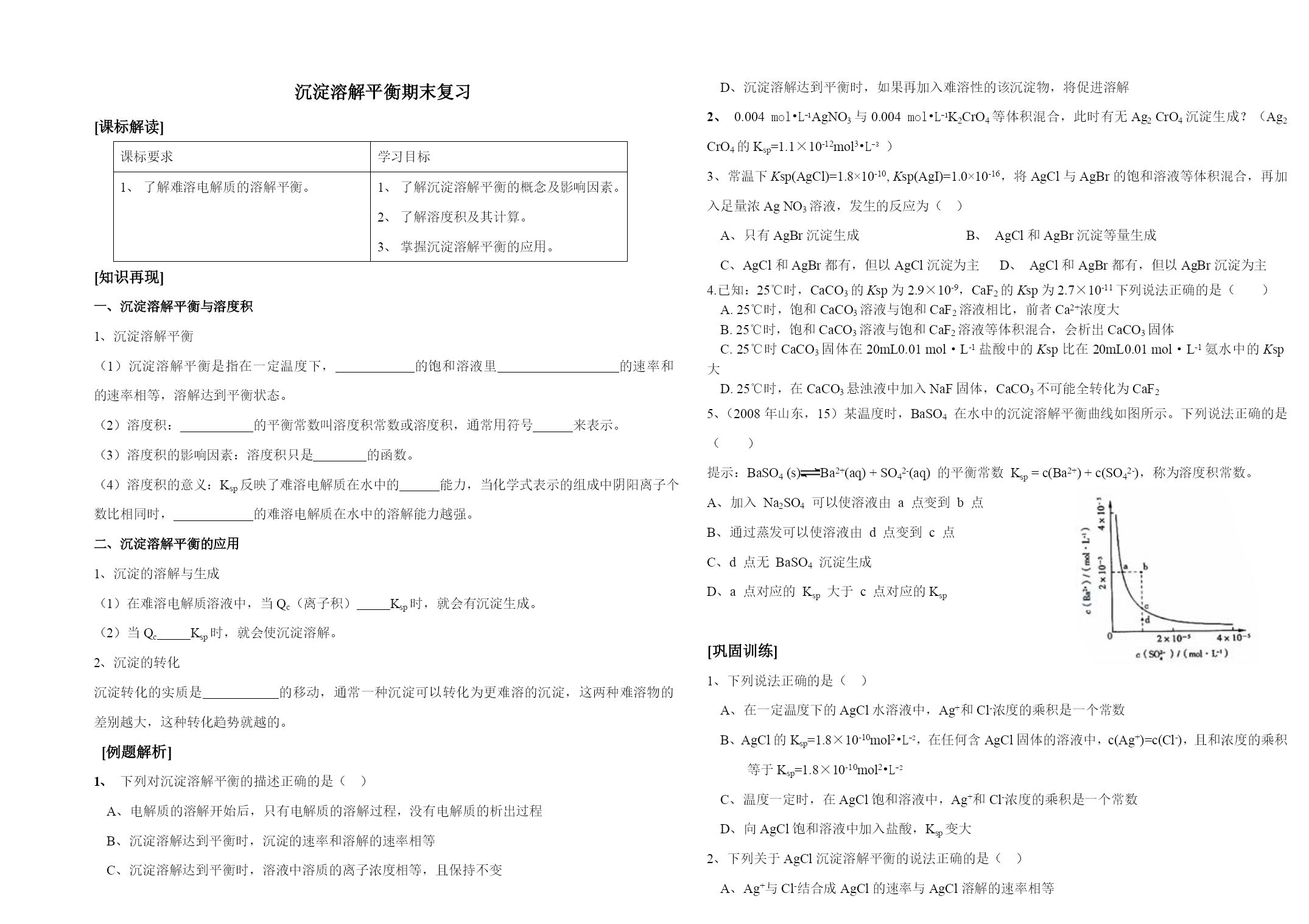 沉淀溶解平衡期末复习[课标解读]课标要求学习目标了解难溶电解质的溶解平衡。了解沉淀溶解平衡的概念及影响因素。了解溶度积及其计算。掌握沉淀溶解平衡的应用。[知识再现]一、沉淀溶解平衡与溶度积1、沉淀溶解平衡(1)沉淀溶解平衡是指在一定温度下,的饱和溶液里的速率和的速率相等,溶解达到平衡状态。(2)溶度积:的平衡常数叫溶度积常数或溶度积,通常用符号来表示。(3)溶度积的影响因素:溶度积只是的函数。(4)溶度积的意义:Ksp反映了难溶电解质在水中的能力,当化学式表示的组成中阴阳离子个数比相同时,的难溶电解质在水